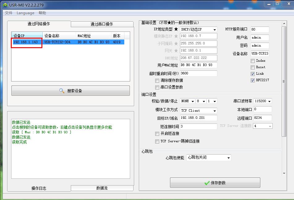 用M0設(shè)置軟件搜索USR-TCP232-304的IP 192.168.1.143