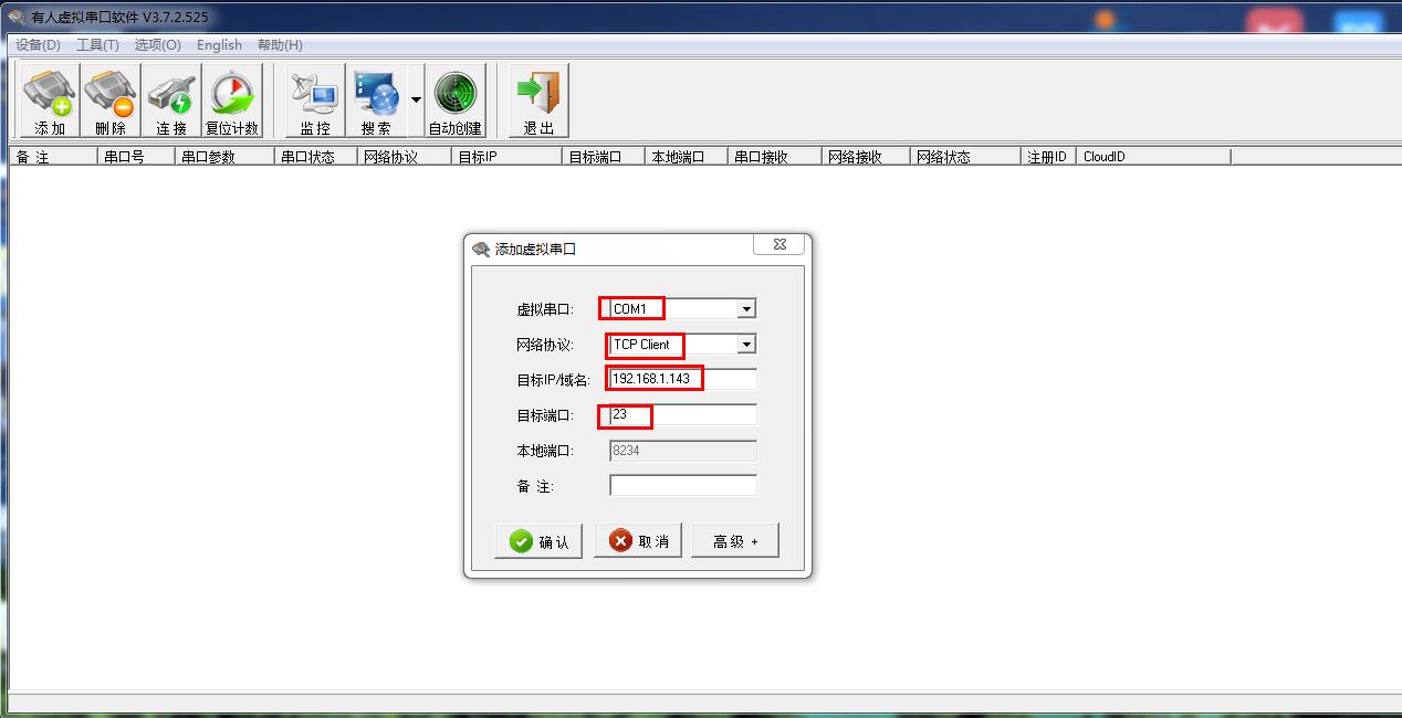 虛擬串口軟件手動(dòng)添加一個(gè)COM1,網(wǎng)絡(luò)協(xié)議設(shè)置TCP client,目標(biāo)IP填192.168.1.143,目標(biāo)端口填23。