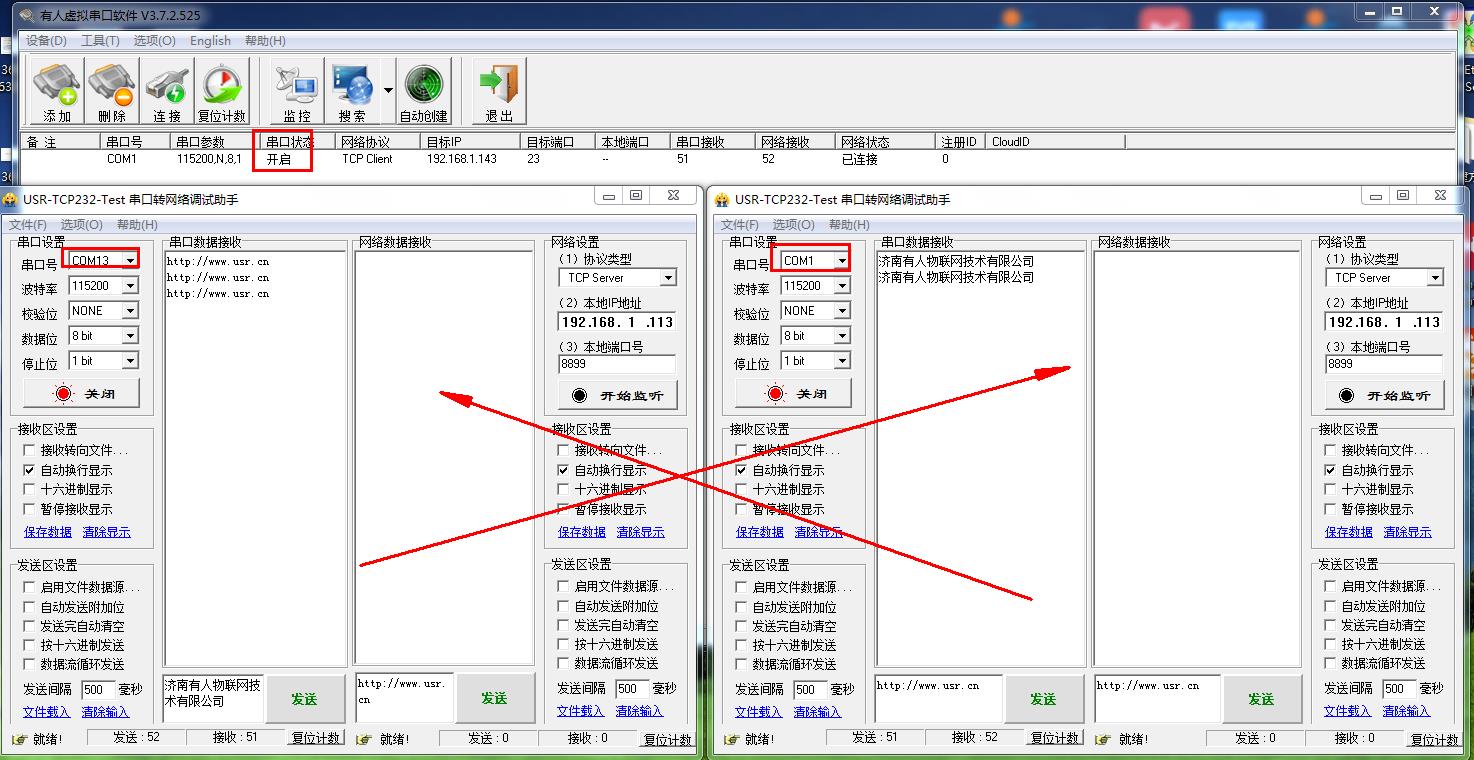 分別打開USR-TCP232-304實(shí)際串口COM13,虛擬串口COM1。