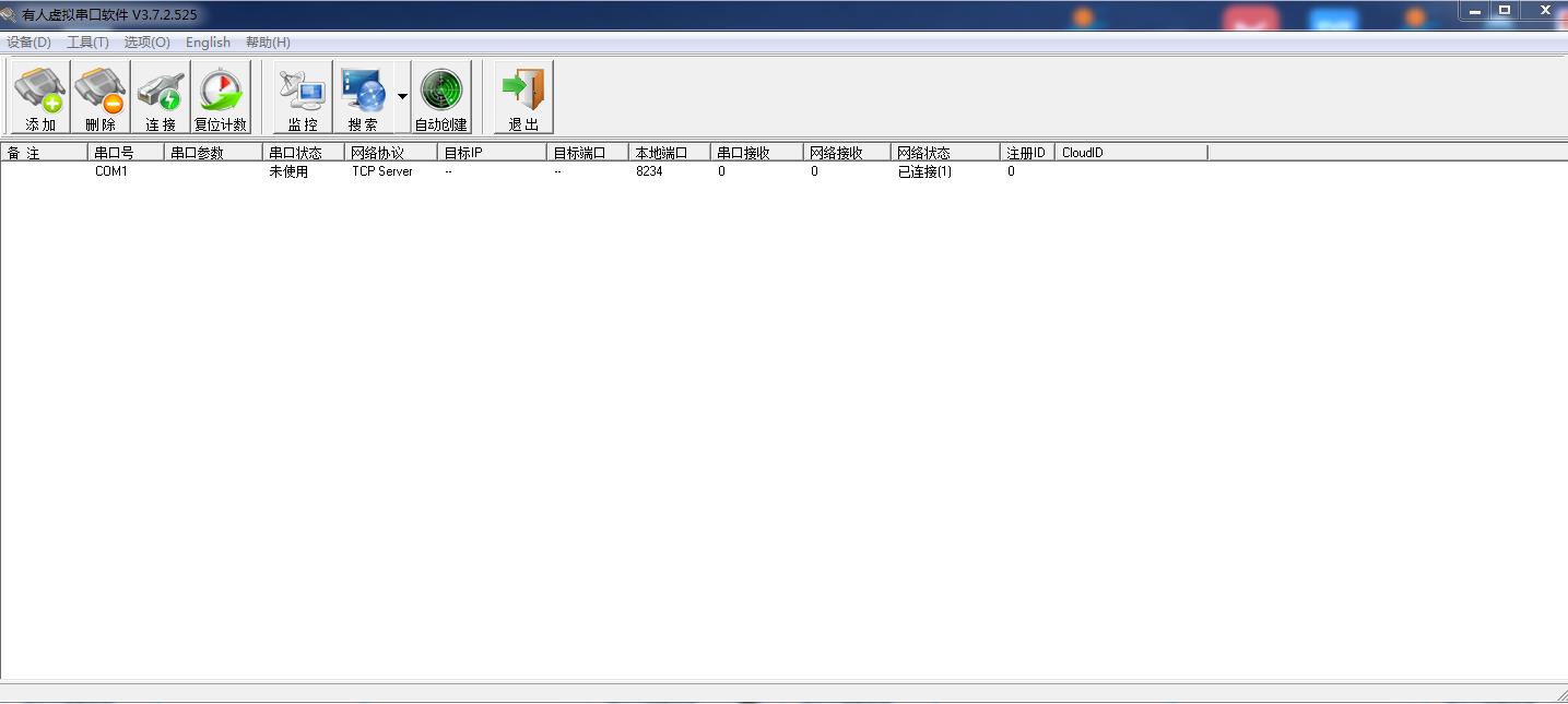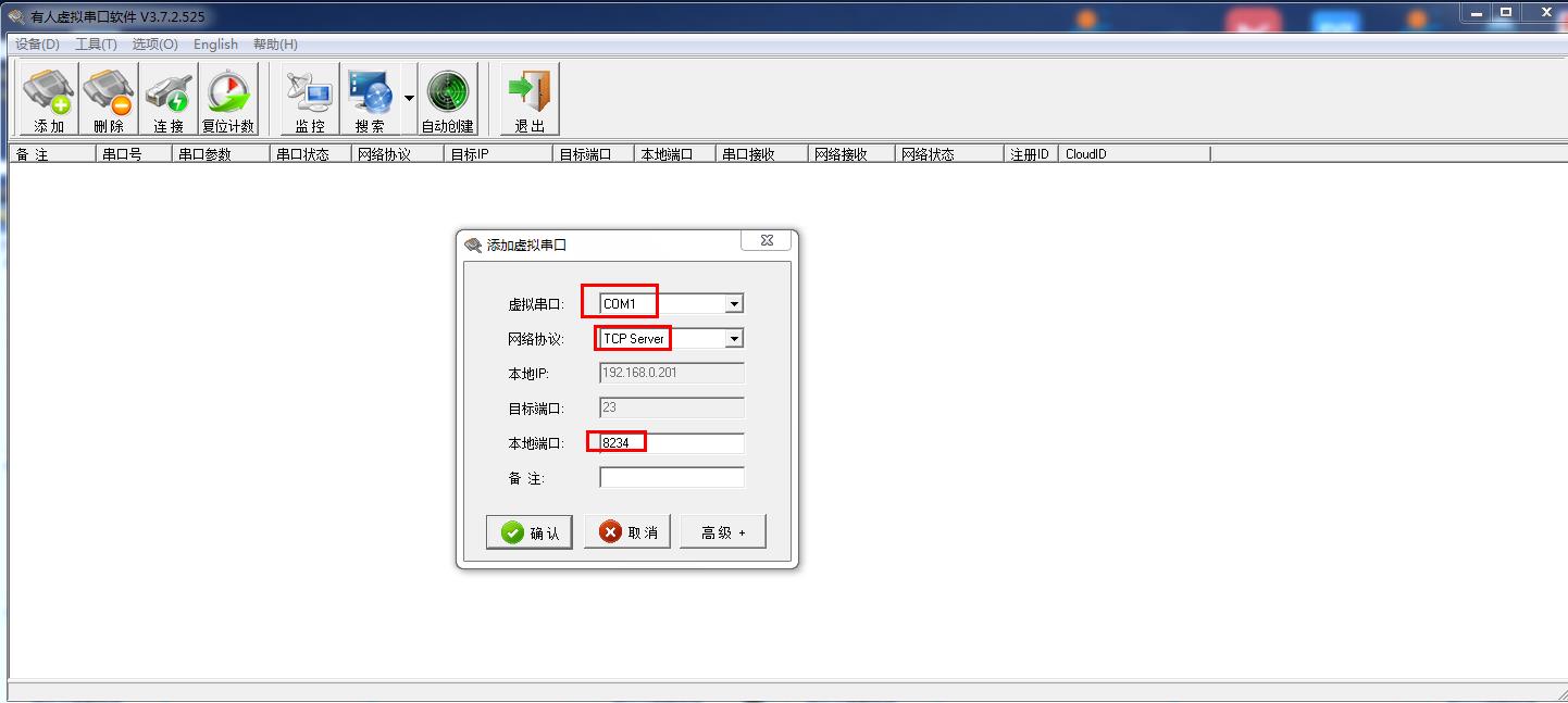虛擬串口軟件手動(dòng)添加一個(gè)COM1,網(wǎng)絡(luò)協(xié)議設(shè)置TCP server,本地端口填8234。