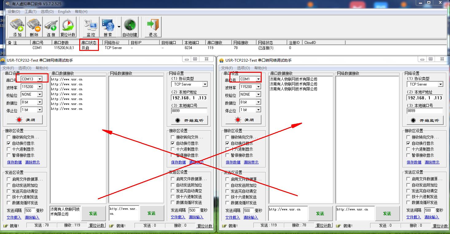 串口參數(shù)設(shè)置和USR-TCP232-304串口參數(shù)一致,測(cè)試實(shí)際串口和虛擬串口之間的數(shù)據(jù)傳輸。