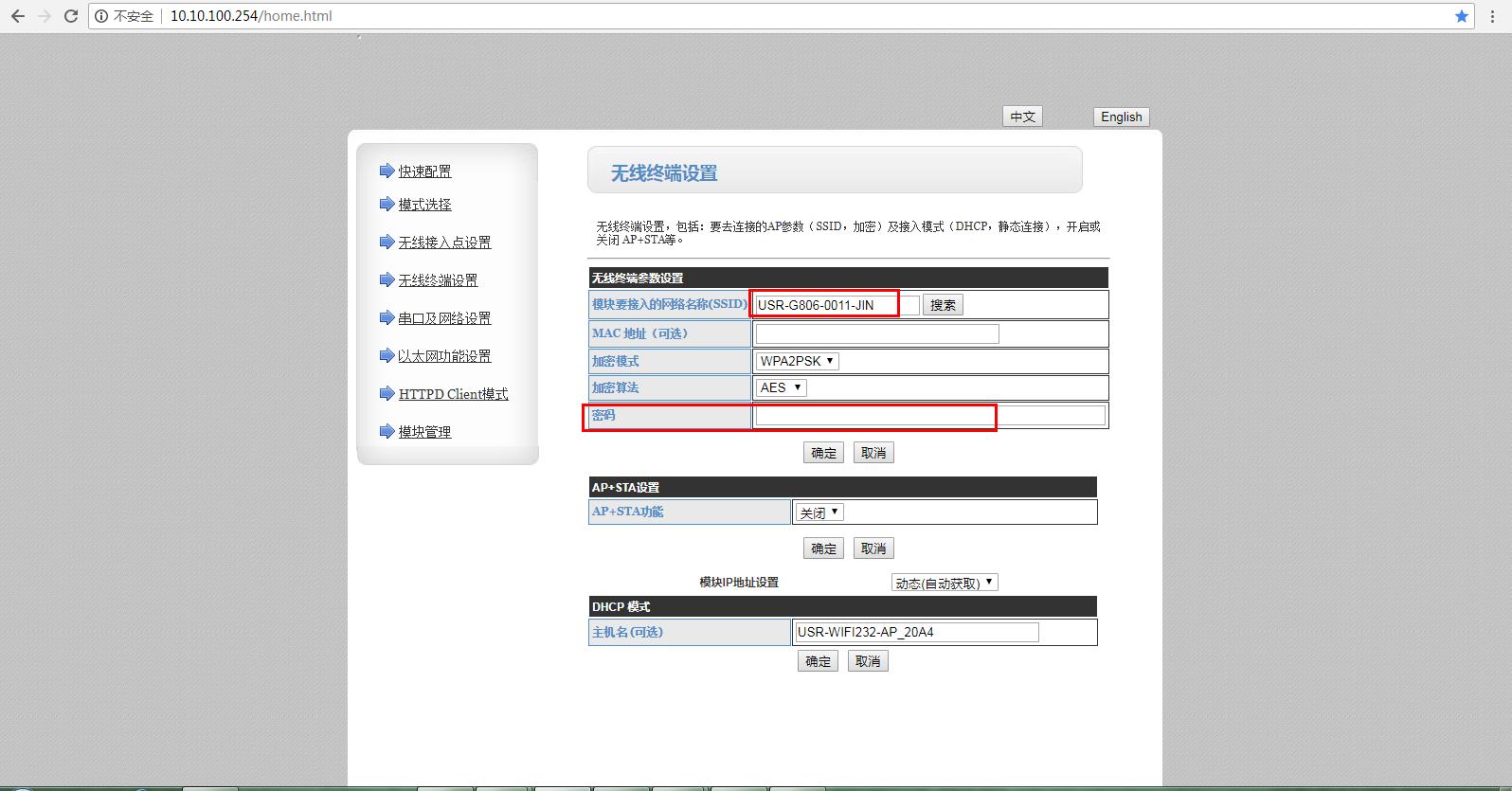 在無線終端設置中,點擊模塊要接入的網絡名稱SSID,可以手動輸入USR-W610設置STA模式要連接路由器wifi的名稱,或者點擊后面的搜索,搜索路由器的wifi。勾選,并點擊APPLY應用。跳出輸入路由器wifi密碼提示,輸入路由器的wifi密碼。點擊確定。