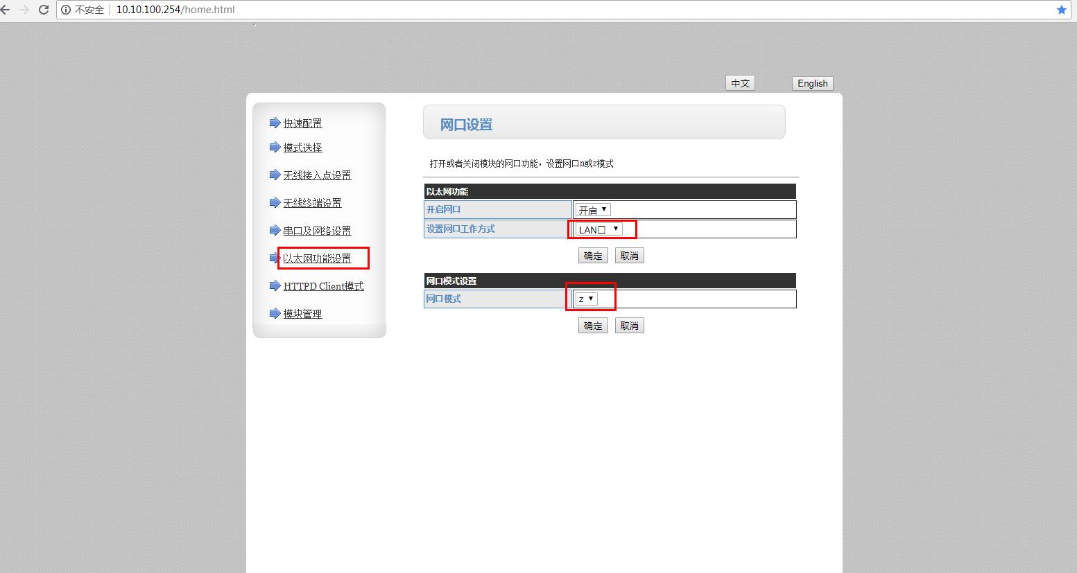 1、在以太網功能設置,網口工作模式是LAN口,網口模式設置Z。就是橋接模式。默認是n模式,需要改為z模式。點擊確定。