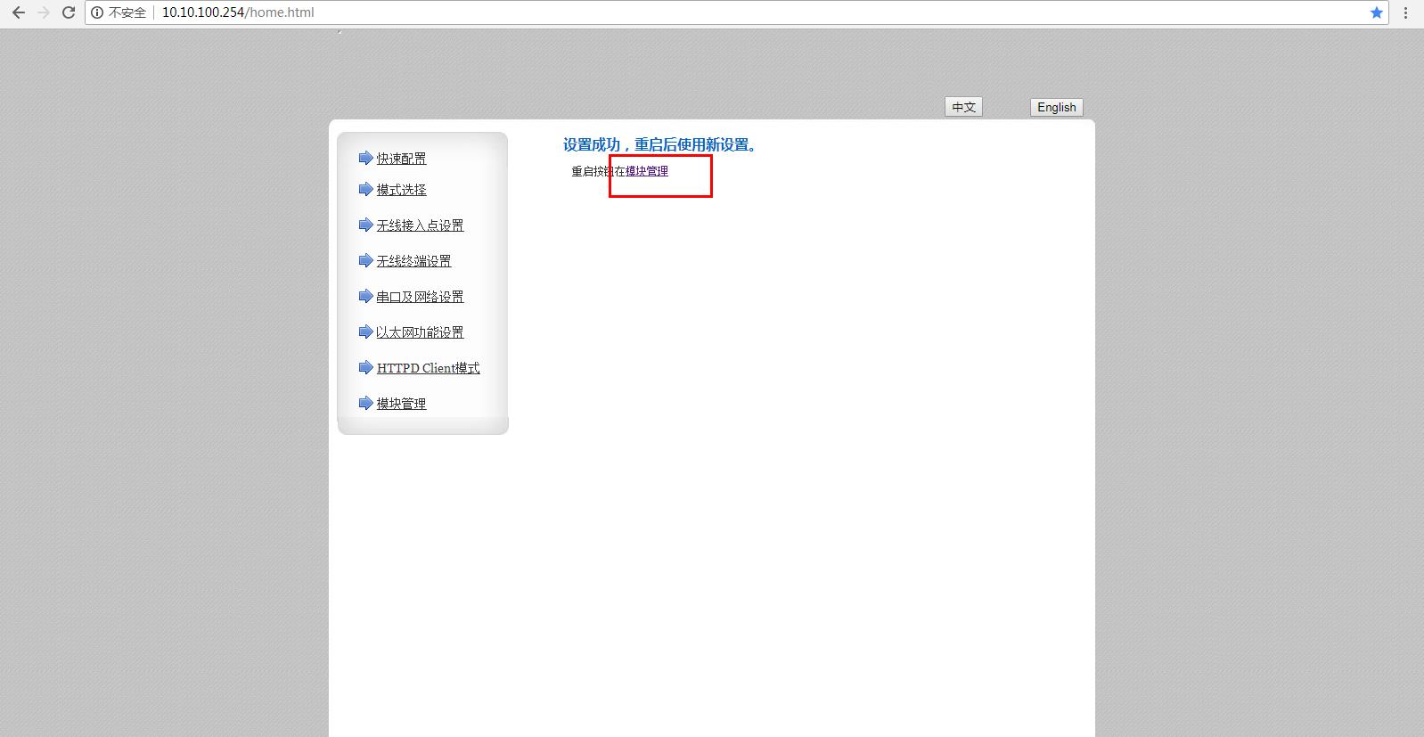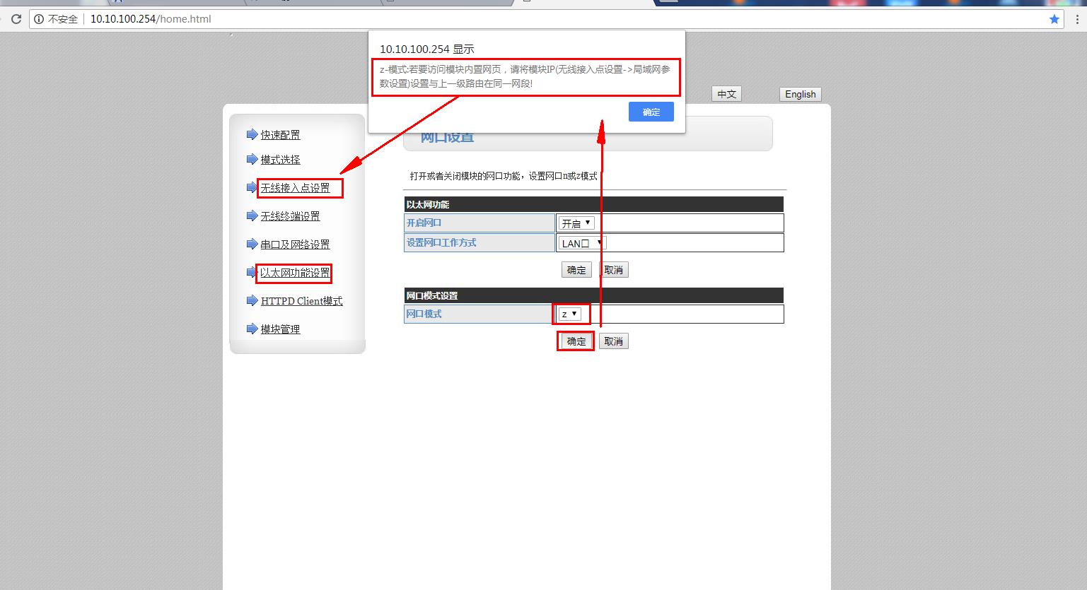 會跳出提示對話框,z-模式:若要訪問模塊內置網頁,請將模塊IP(無線接入點設置——》局域網參數設置)設置與上一級路由器再同一網段!