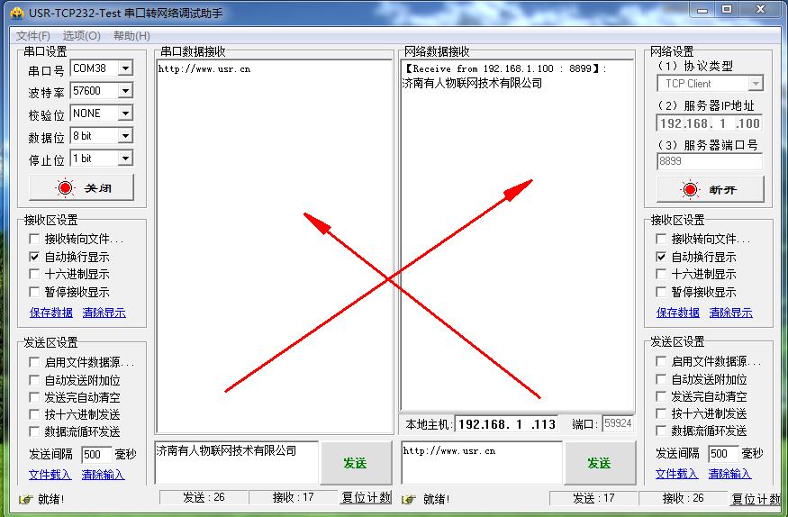 在電腦上用USR-TCP232-TEST軟件測試,打開COM口,網絡端設置參數。