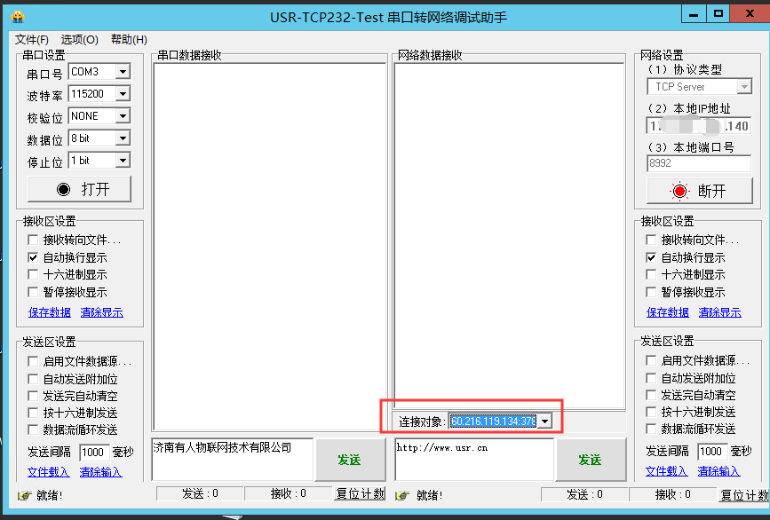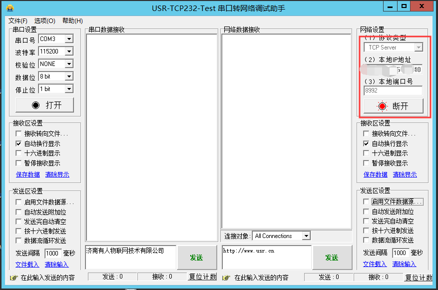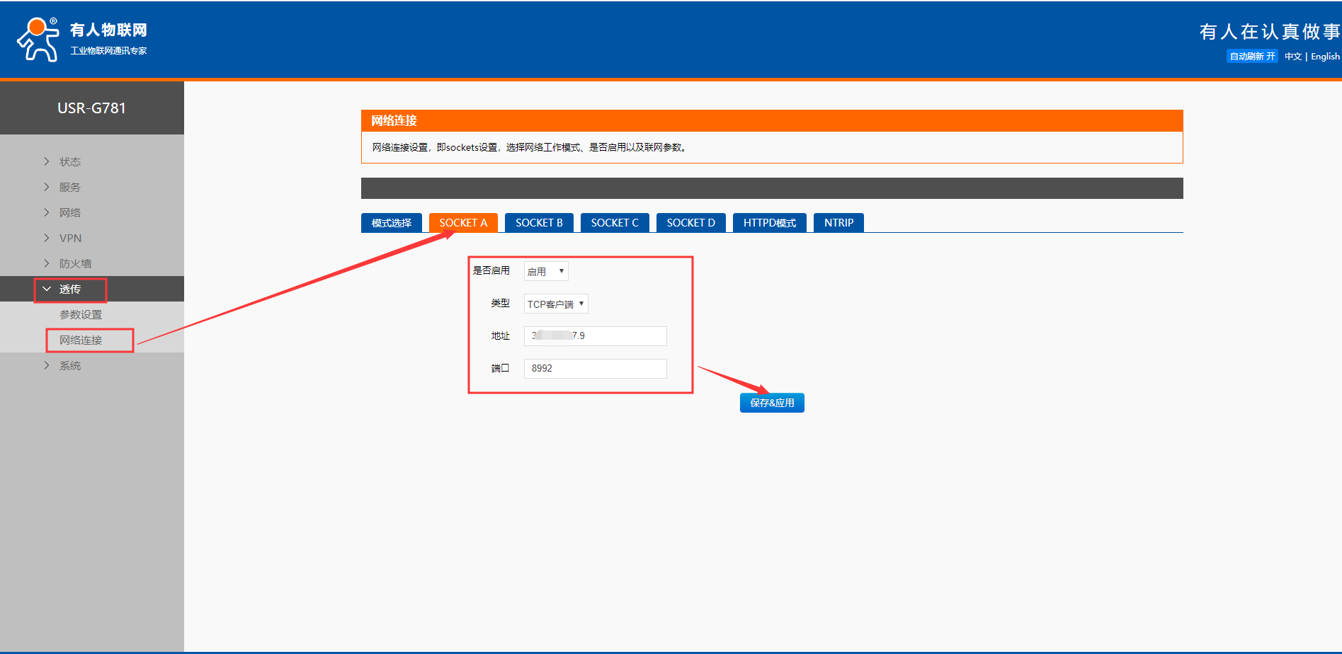 (2)透傳——網絡連接——SOCKETA——啟用——設置IP和端口——保存應用