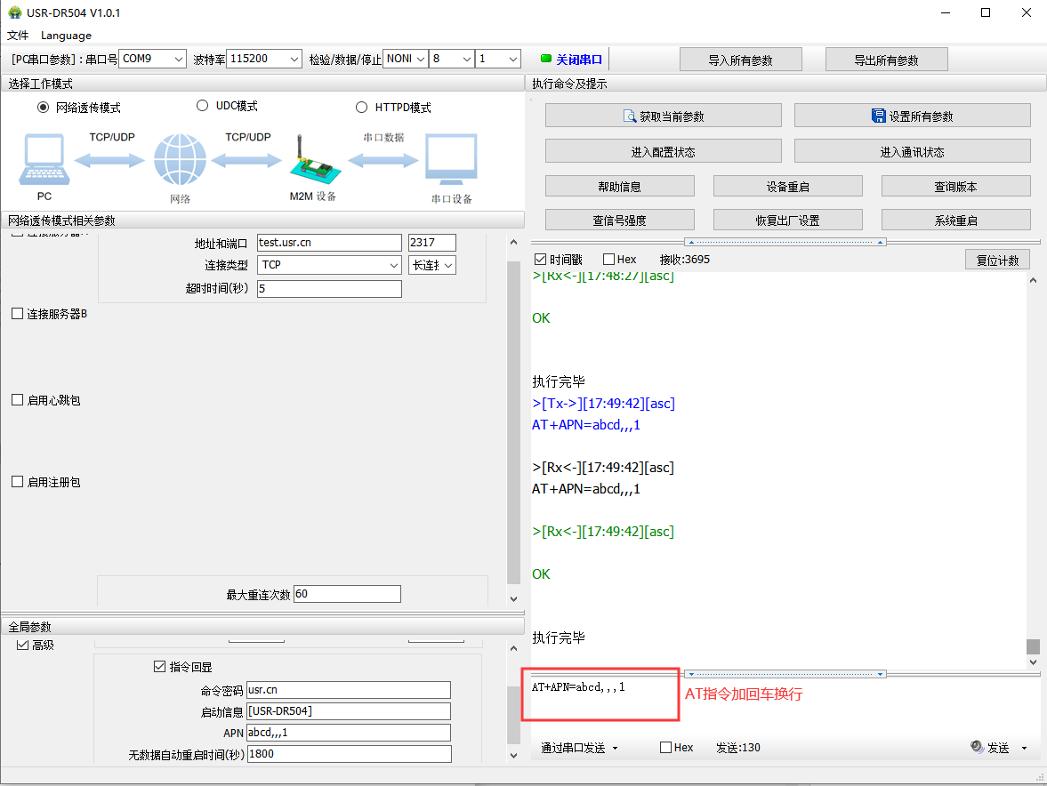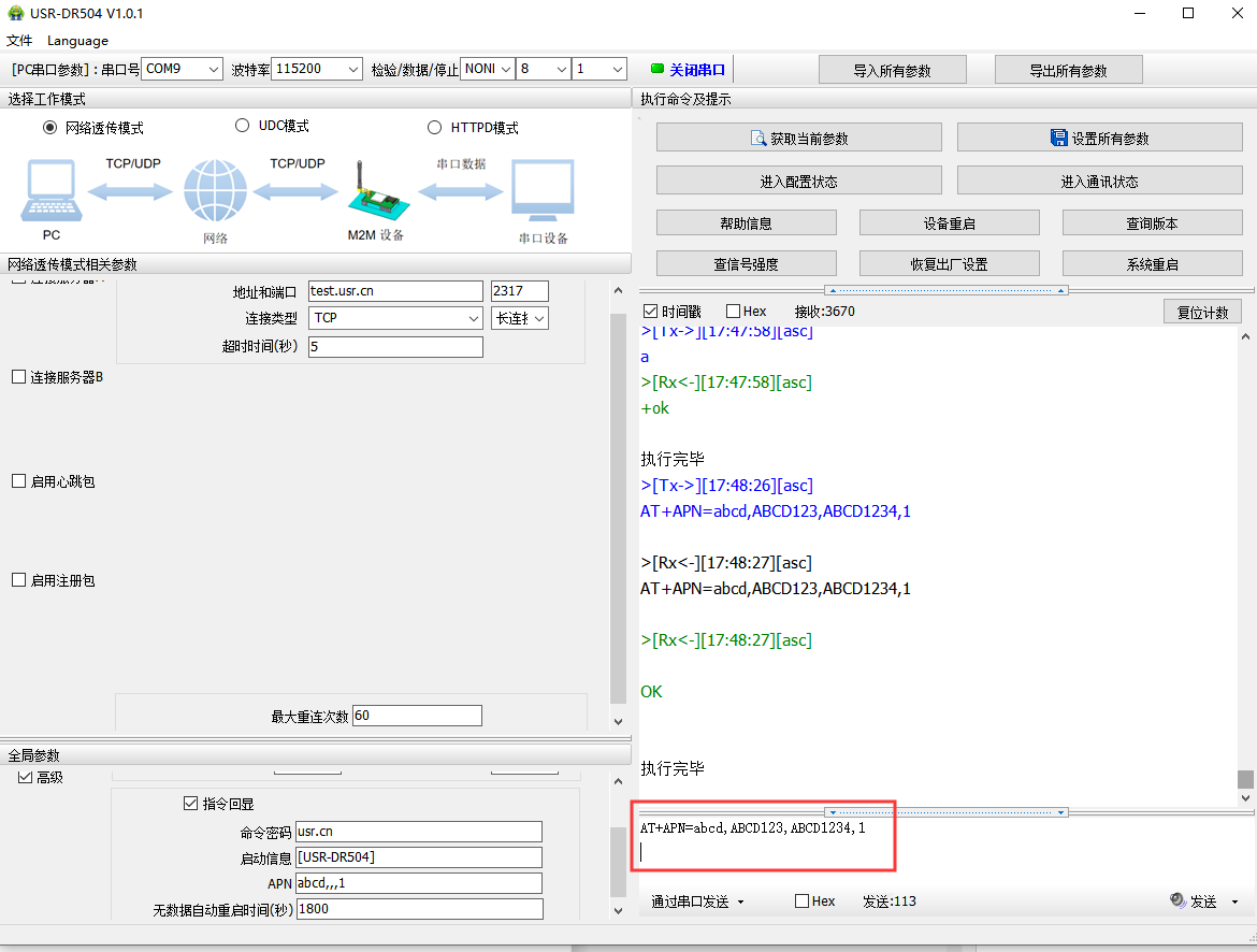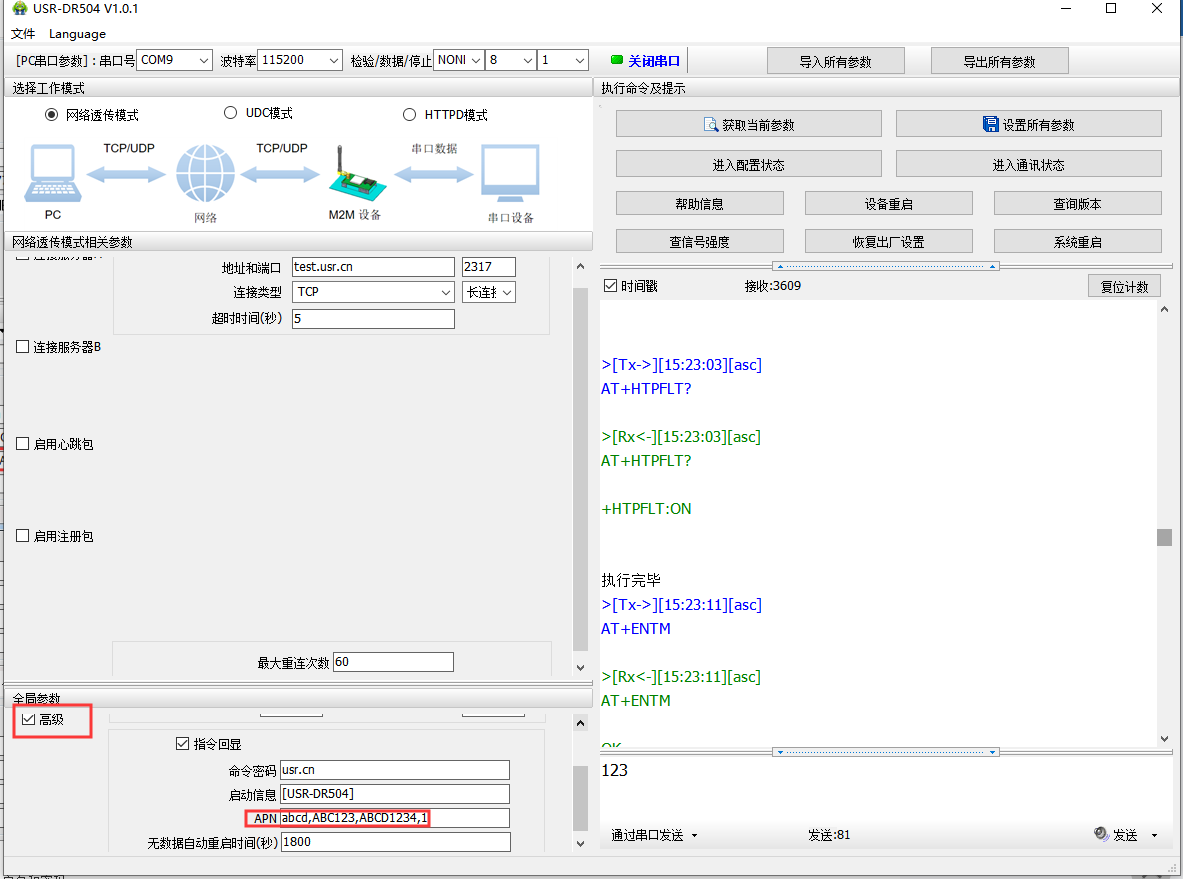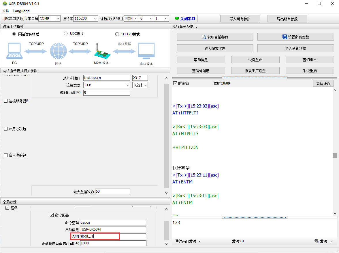 (1)未設置有關APN的相關參數,直接使用APN卡進行聯網和服務器連接,進行相關參數配置之后再進行測試