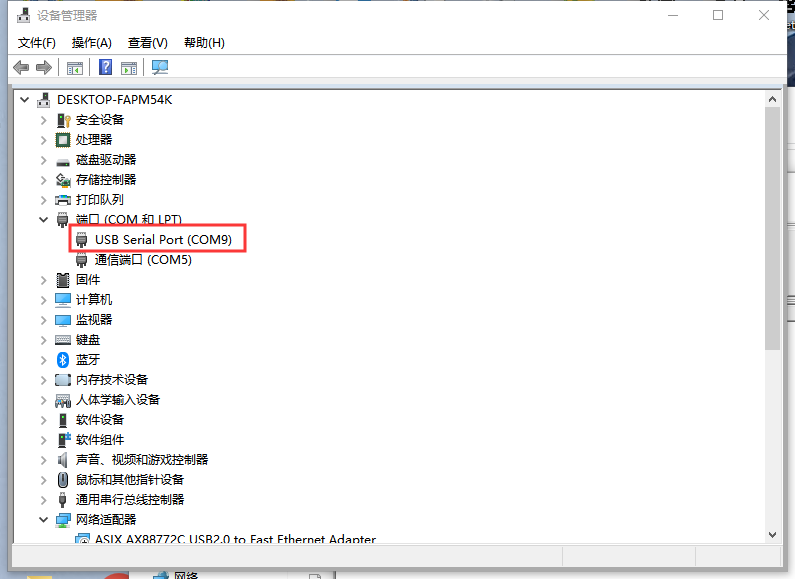 在設備管理器中查看端口信息,確定K7串口使用的串口號,如下圖所示電腦端口號為COM9