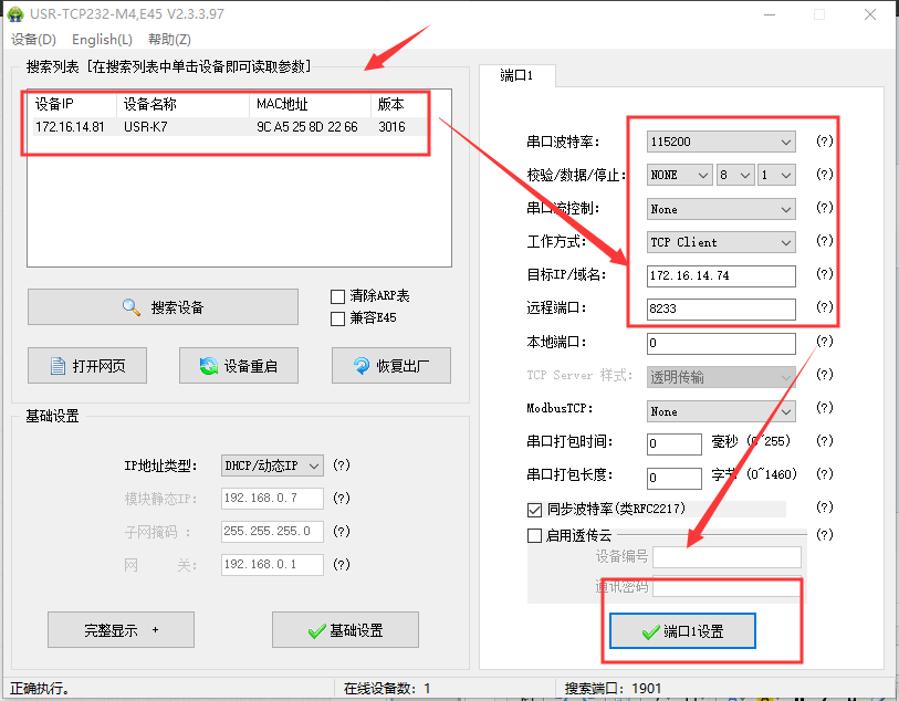 點擊“搜索設備”,當搜索列表中出現K7的設備后,單擊搜索到的設備,設置配置信息并保存(動態IP)