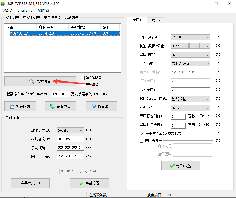 3. 打開M4設(shè)置軟件,點(diǎn)擊搜索設(shè)備,可看到搜索到的設(shè)備,點(diǎn)擊選中,可看到IP地址類型為靜態(tài)IP。