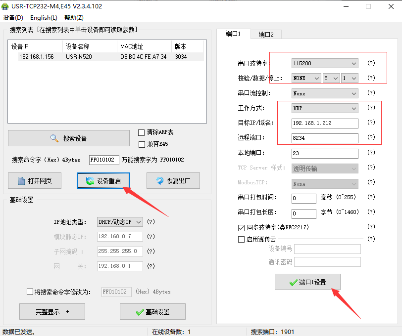4. 更改IP地址類型為DHCP/動(dòng)態(tài)IP,點(diǎn)擊基礎(chǔ)設(shè)置保存參數(shù),工作方式選擇UDP,目標(biāo)IP:192.168.1.219(路由器分配給電腦的IP),遠(yuǎn)程端口號(hào):8234,設(shè)置完成后點(diǎn)擊端口1設(shè)置保存參數(shù),設(shè)備重啟使參數(shù)生效。