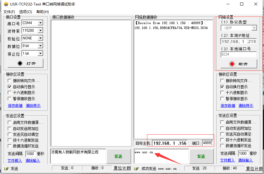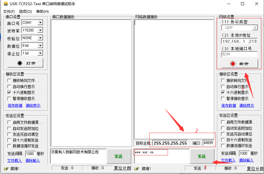 6. 打開串口調(diào)試助手,網(wǎng)絡(luò)設(shè)置為UDP協(xié)議類型,本地IP為192.168.1.219,本地端口:8234,點(diǎn)擊連接,更改目標(biāo)主機(jī)IP:255.255.255.255,端口:48899,通過(guò)廣播的方式發(fā)送搜索關(guān)鍵字m.0575400.com(區(qū)分大小寫)