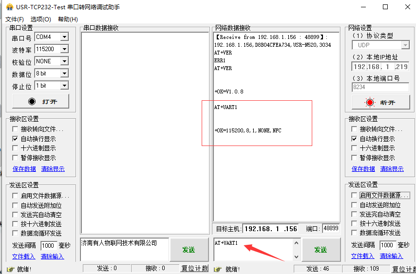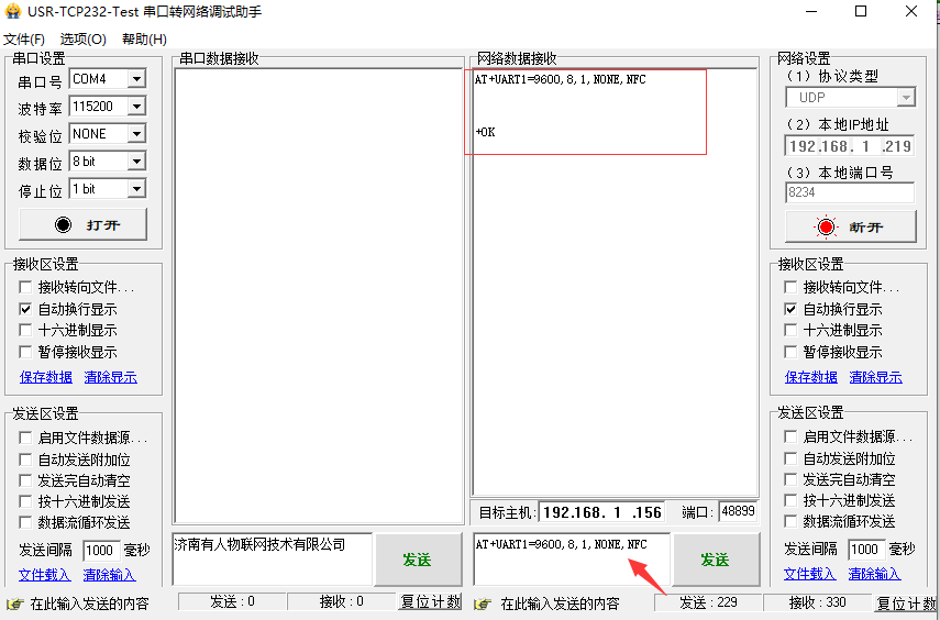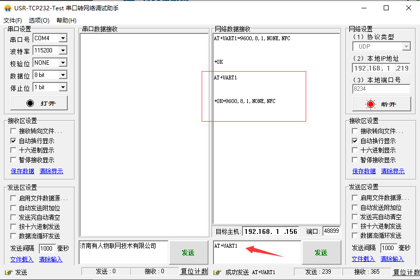 9. 修改參數(shù):按照AT指令的格式,發(fā)送正確的AT指令設(shè)置參數(shù),AT+UART1=9600,8,1,NONE,NFC返回OK后表示設(shè)置成功,可以再次查詢,可看到串口參數(shù)已經(jīng)改變