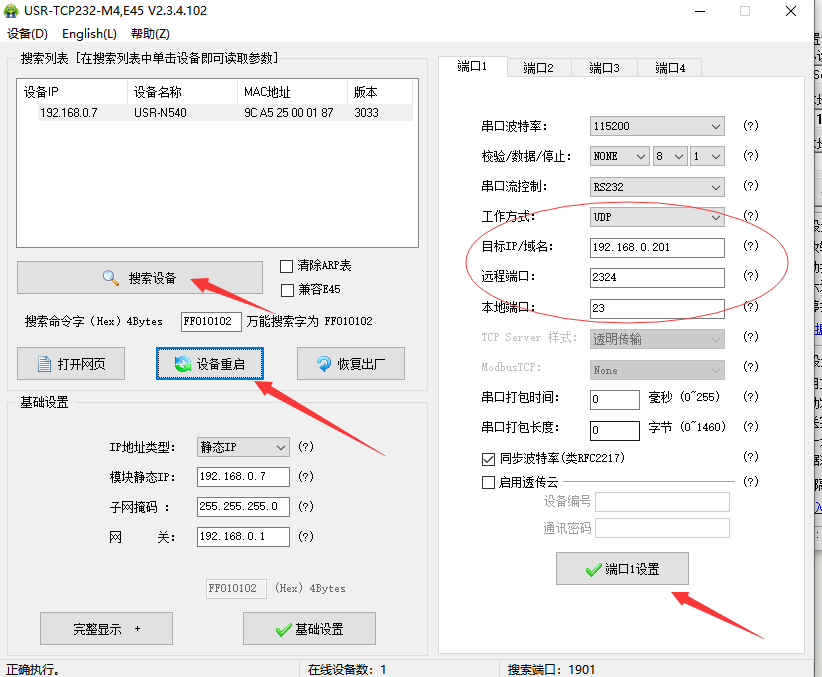 3. 打開M4設(shè)置軟件,點(diǎn)擊搜索設(shè)備,可看到搜索到的設(shè)備,點(diǎn)擊選中,可看到N540的參數(shù) ,工作方式選擇UDP,目標(biāo)IP:192.168.0.201,遠(yuǎn)程端口:2324,點(diǎn)擊端口1設(shè)置保存參數(shù),然后點(diǎn)擊設(shè)備重啟,重啟設(shè)備使參數(shù)生效