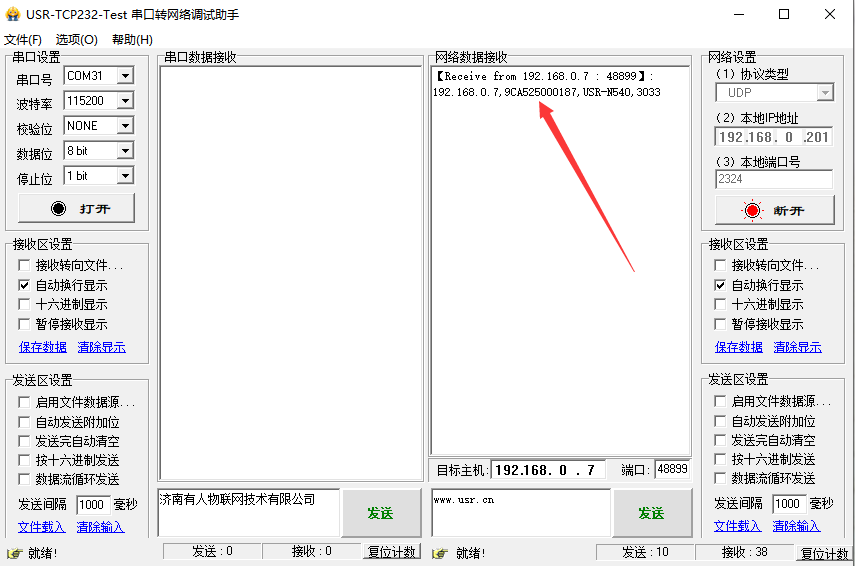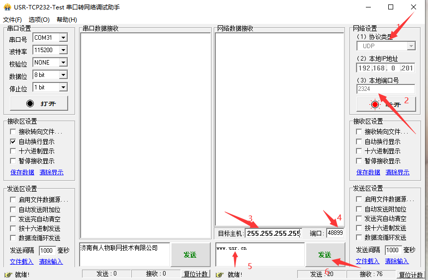 4. 打開串口調(diào)試助手,網(wǎng)絡(luò)設(shè)置為UDP協(xié)議類型,本地IP為192.168.0.201,本地端口:2324,點(diǎn)擊連接,更改目標(biāo)主機(jī)IP:255.255.255.255,端口:48899,通過廣播的方式發(fā)送搜索關(guān)鍵字m.0575400.com(區(qū)分大小寫)