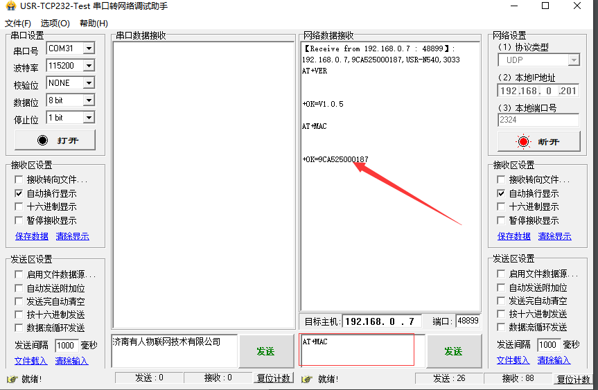 6. 查詢參數(shù):根據(jù)AT指令集發(fā)送標(biāo)準(zhǔn)AT指令,AT+VER查詢版本號(hào),AT+MAC查詢MAC(AT指令后加回車換行)