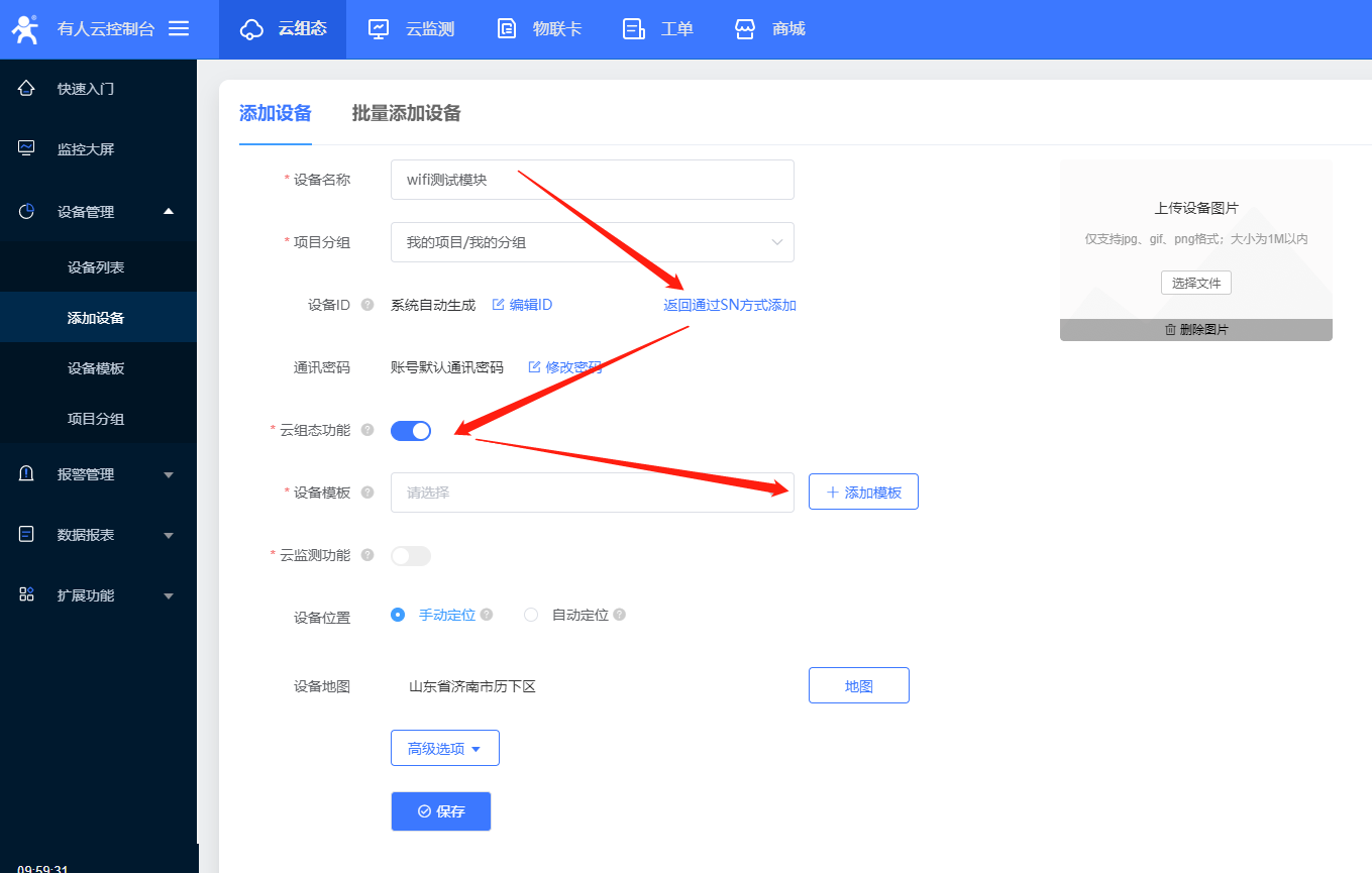 5、本次案例是C215連有人云進行數據顯示,可以進入云組態,選擇添加設備。