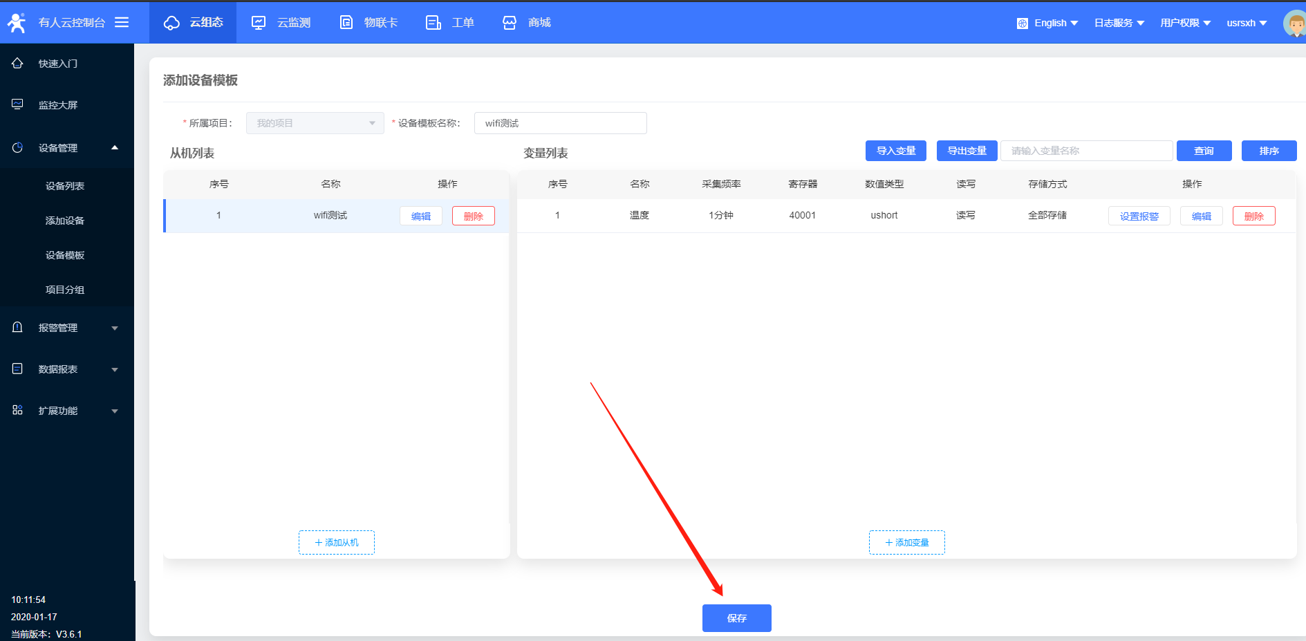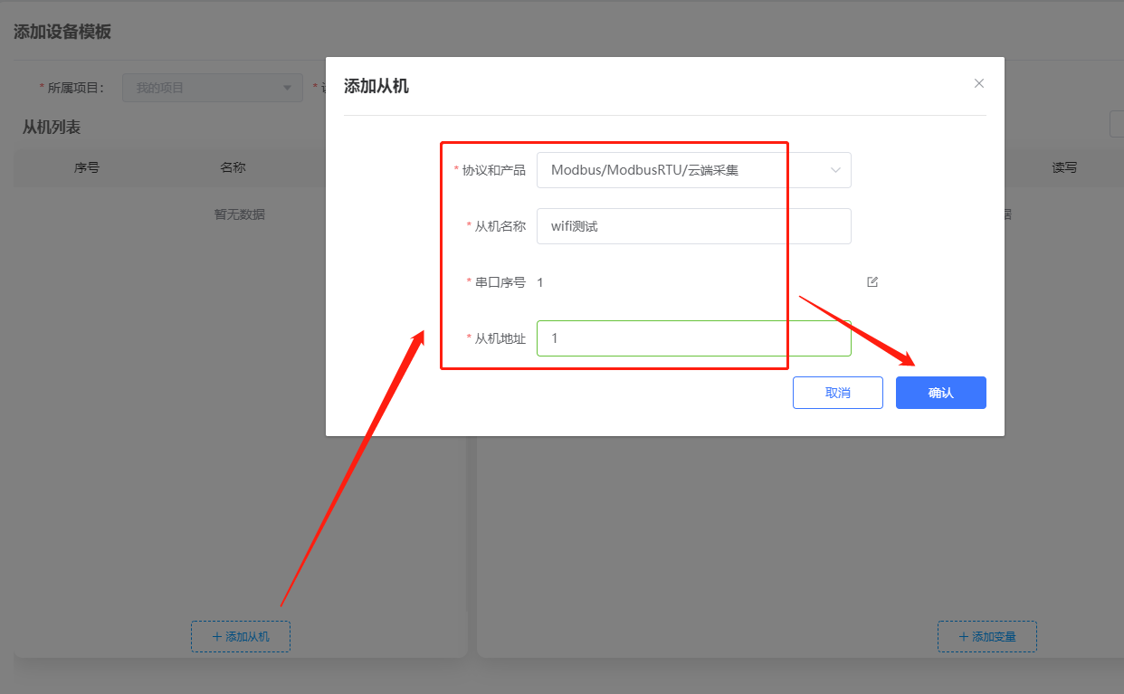 7、模板更改名稱,選擇“Modbus” - “ModbusRTU” - “云端采集”,點擊“確認添加”。