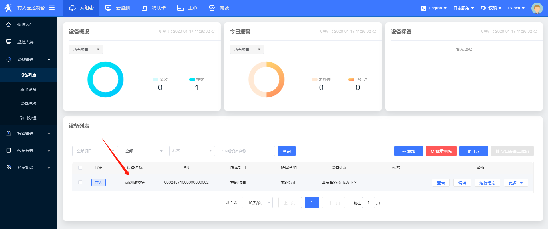 15、設置完所有的參數要重啟設備,稍等一會,在有人云界面,您會看到設備已經上線