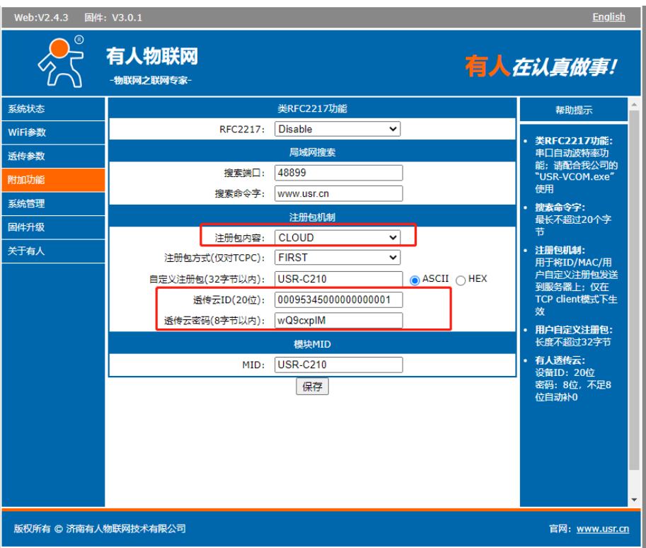 5>附加功能--注冊(cè)包--開(kāi)啟--類(lèi)型選擇cloud,將之前云端添加的C210的設(shè)備ID和密碼填寫(xiě)到注冊(cè)包里