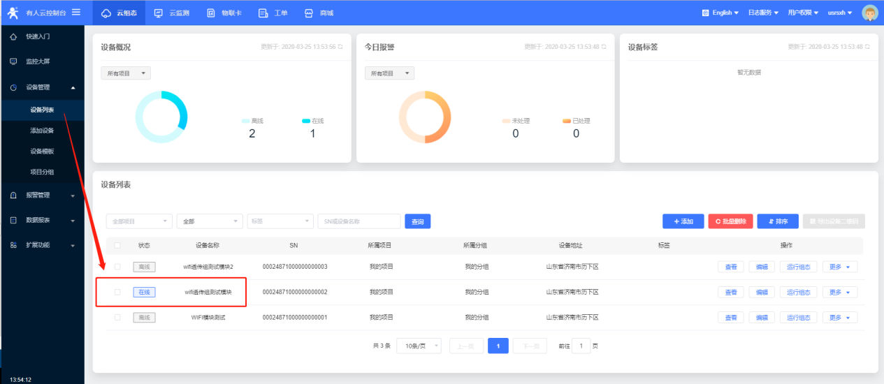 19、稍等一會,在有人云界面,您會看到該設備已經上線。