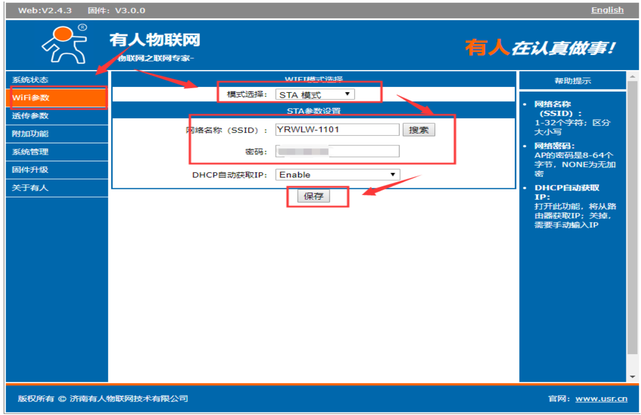 2、進入內置網頁(10.10.100.254)內置網頁的賬號和密碼都是admin。進入透傳參數,選擇透傳模式,服務器地址:clouddata.usr.cn端口15000,保存