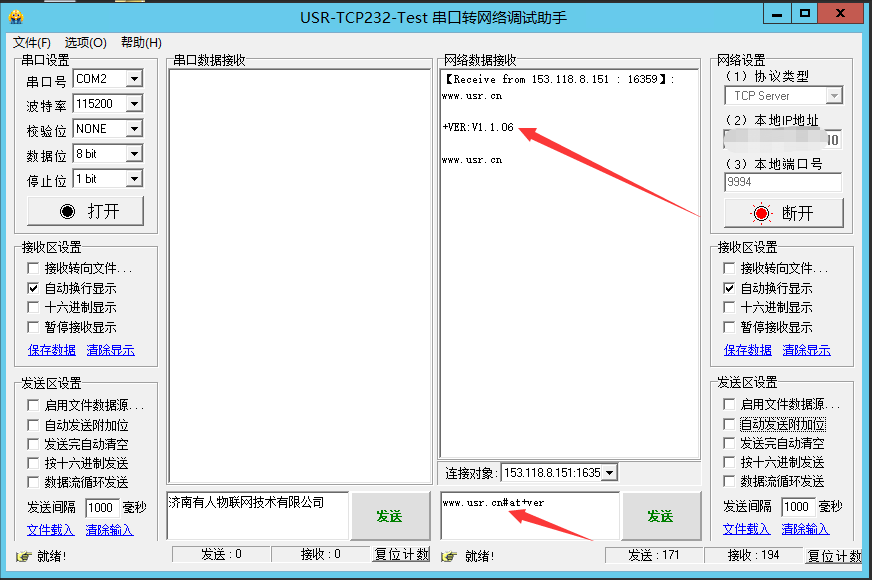 3.在遠程服務器端輸入m.0575400.com#at+ver加回車(注:回車必須加,若不加回車會返回錯誤警告),點擊發送,會返回781的固件版本號。(網絡at指令使用的是命令密碼+at指令的方式。命令密碼默認狀態下是m.0575400.com#。若您忘記了命令密碼,可以通過at指令AT+CMDPW來查詢命令密碼)