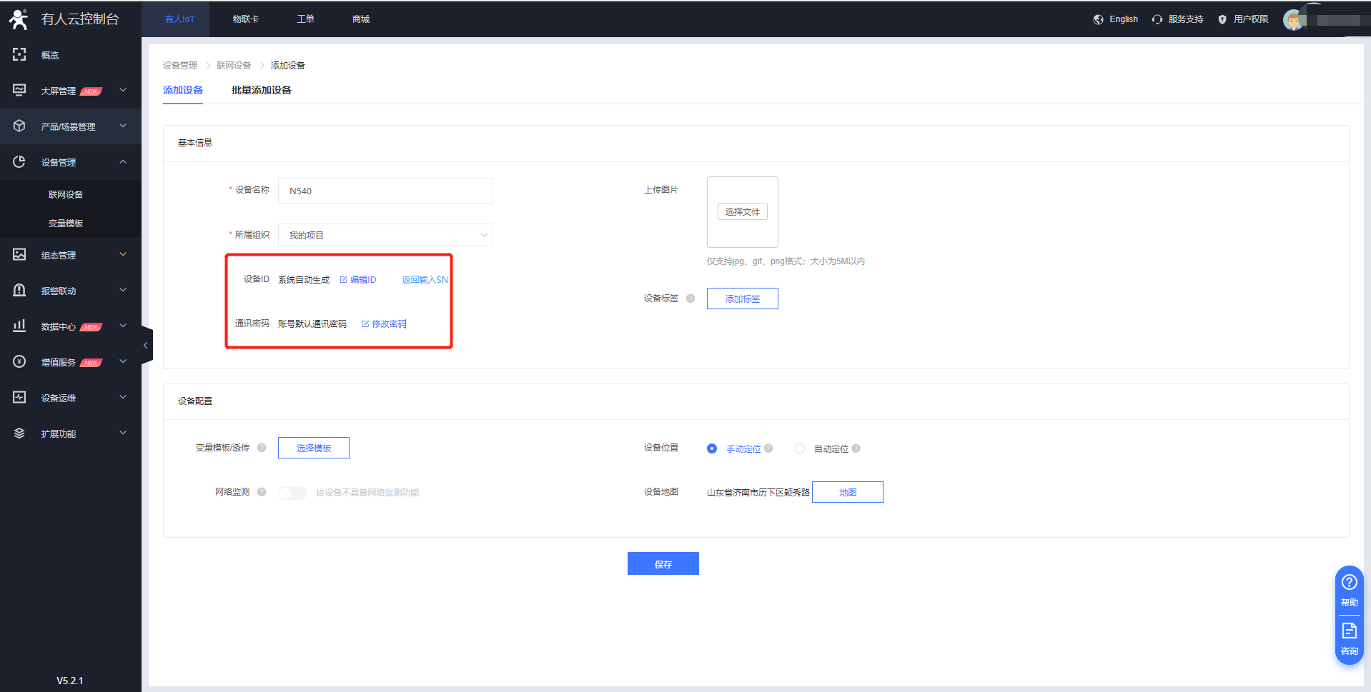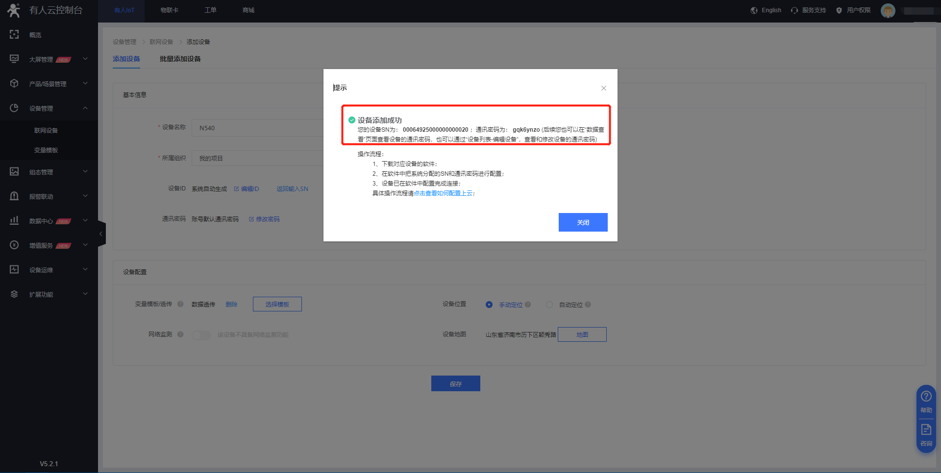 5、可以在這里看到默認生成的設(shè)備編號和通信密碼,點擊完成,云端成功添加設(shè)備