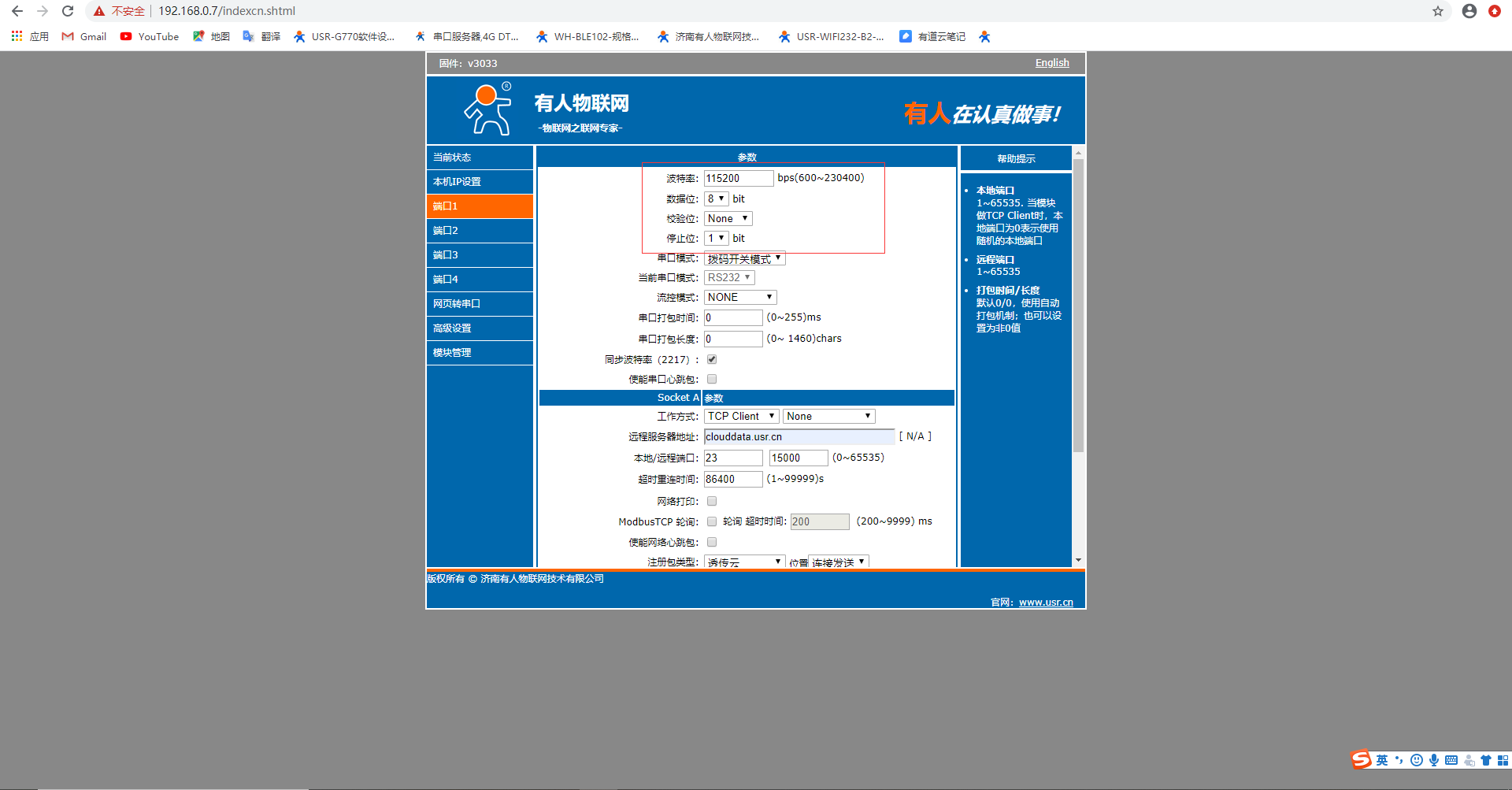 11、工作方式選擇TCP Client,遠程服務(wù)器地址:clouddata.usr.cn,遠程端口:15000,本地端口不要設(shè)置為0,默認即可。注冊包類型選擇透傳云,設(shè)備編號和密碼填寫為在云端添加設(shè)備生成的設(shè)備編號和密碼(圖片中的為測試生成的,請?zhí)顚懽约旱脑O(shè)備編號和密碼),點擊保存設(shè)置,保存設(shè)置好的參數(shù)。