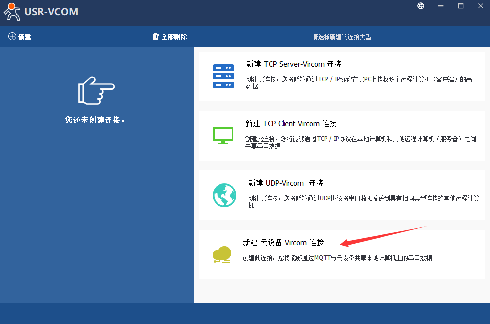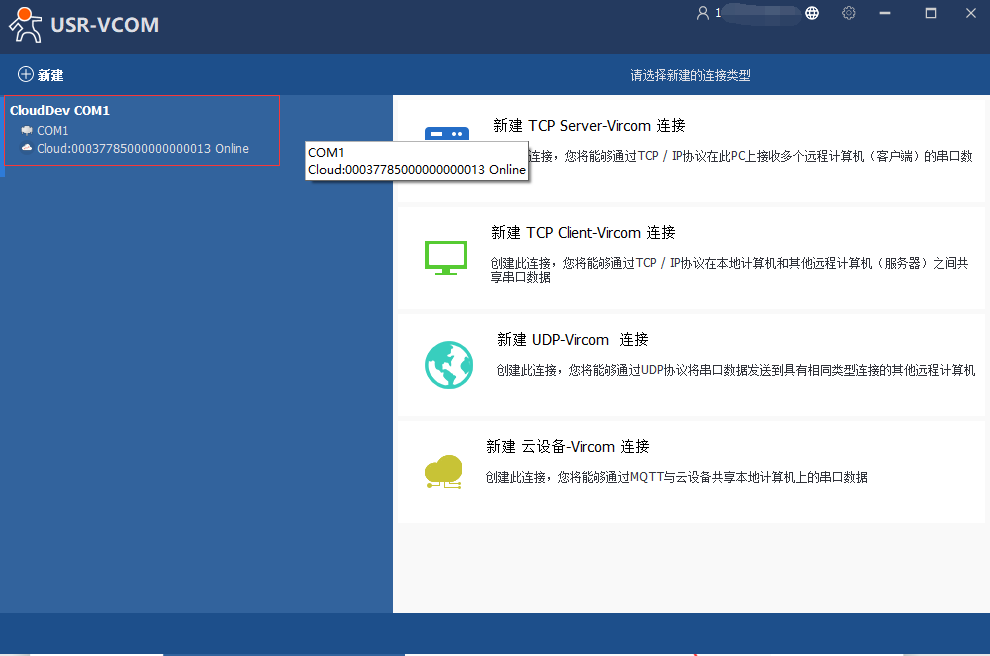 14、打開VCOM虛擬串口軟件,點擊新建云設(shè)備-Vircom連接