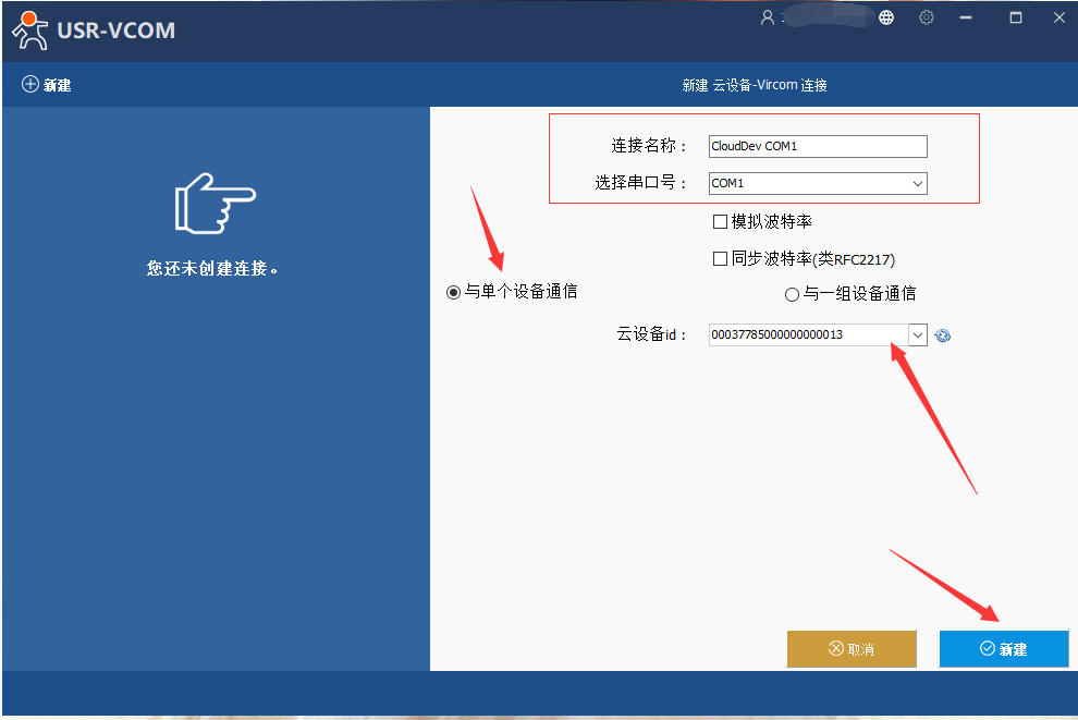 16、選擇com口,不要和電腦上已存在的com口沖突,選擇與單個設(shè)備通信,云設(shè)備ID選擇在云端添加的其中一個N540的設(shè)備編號,點擊新建,生成串口
