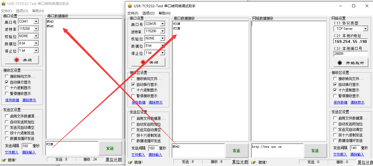 17、用串口調(diào)試助手打開N540的串口和VCOM生成的串口,進行數(shù)據(jù)收發(fā)測試