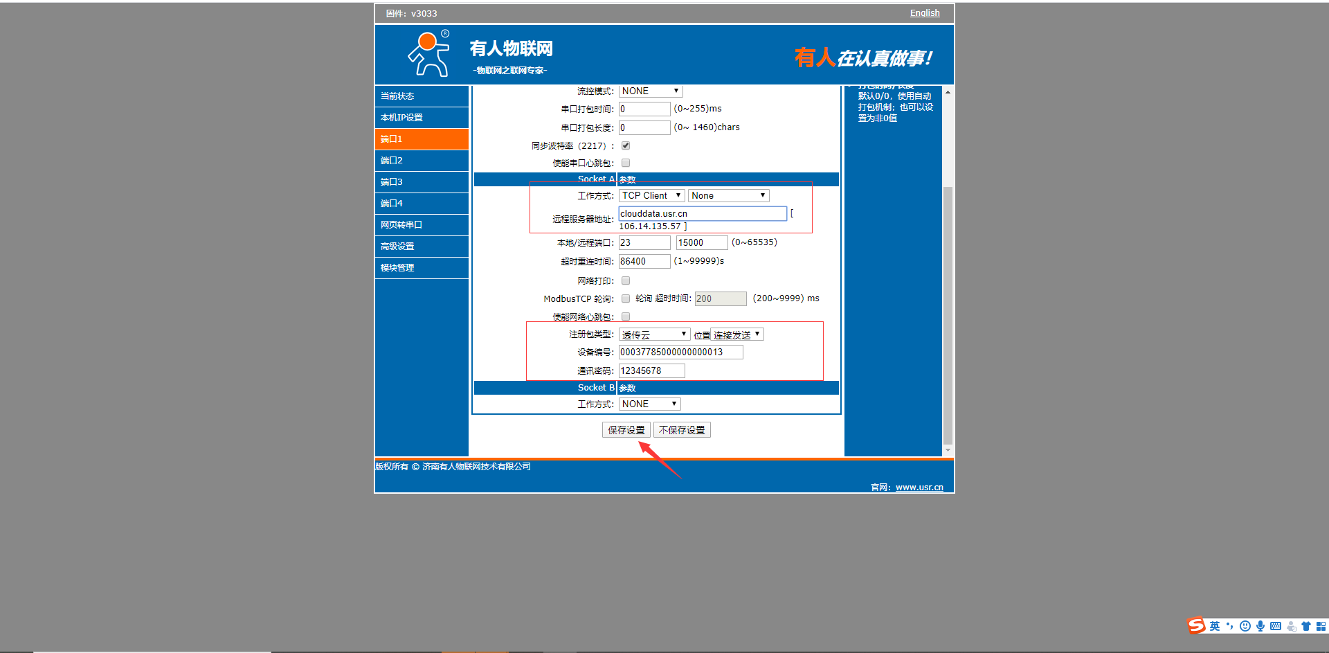7.勾選啟用透傳云,將有人云中添加過的540的SN和密碼填入(SN與密碼可以通過操作下面的案例獲取)--設置完成后點擊保存參數。