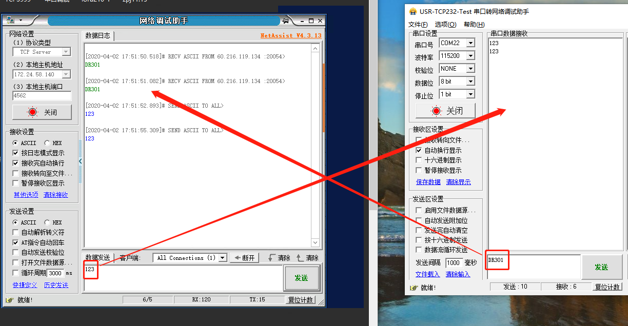 5、打開串口調試助手,填寫串口參數和DR301的串口參數并保持一致,打開串口,即可和服務器建立通信。