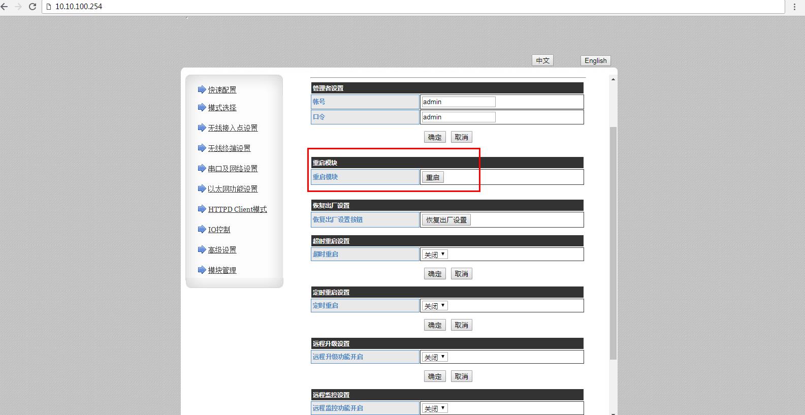 USR-WIFI232-B2默認Ip是10.10.100.254,用這個Ip,在瀏覽器輸入,進入USR-WIFI232-B2的內置網頁,可以對B2模塊進行參數查看和參數配置。登錄用戶名和密碼都是admin。
