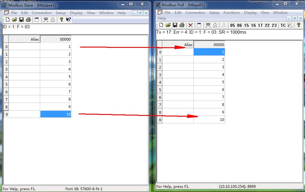 用MODBUS SLAVE軟件改變數值,MODBUS pOLL就可以讀取到數據。