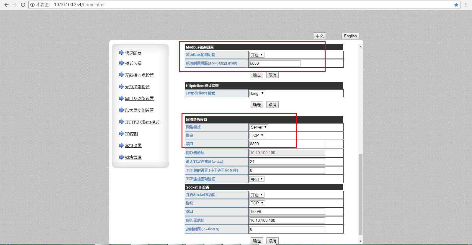 網頁上設置Ap模式,開啟MODBUS TCp轉MODBUS RTU模式。串口及網絡設置,設置串口參數。MODBUS輪詢設置開啟,時間設置5000ms。網絡模式設置TCp server,端口8899。