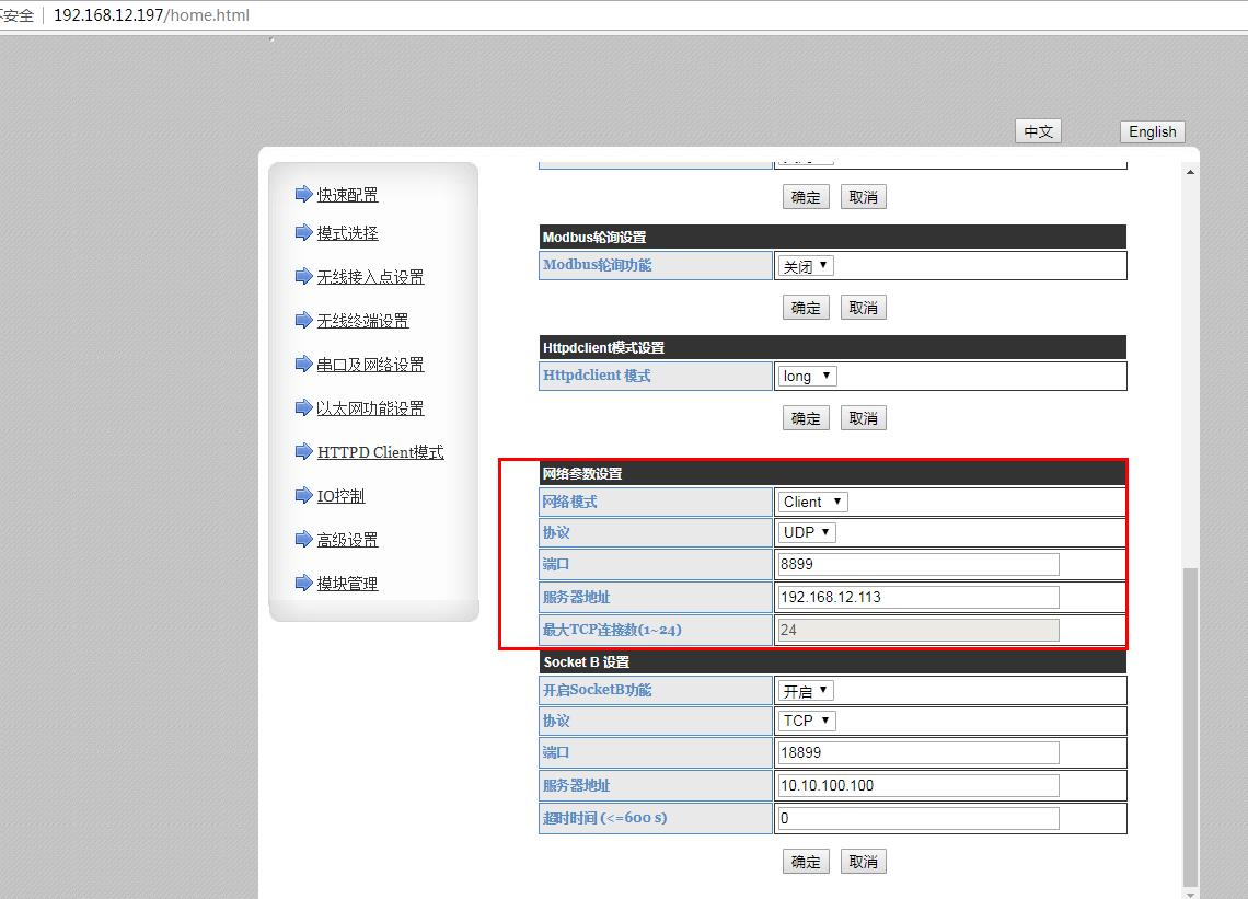 用USR-WIFI232-B2的Ip 登錄USR-WIFI232-B2的網頁,然后修改B2的串口參數。測試4種工作模式下,串口和網絡的數據透傳。
