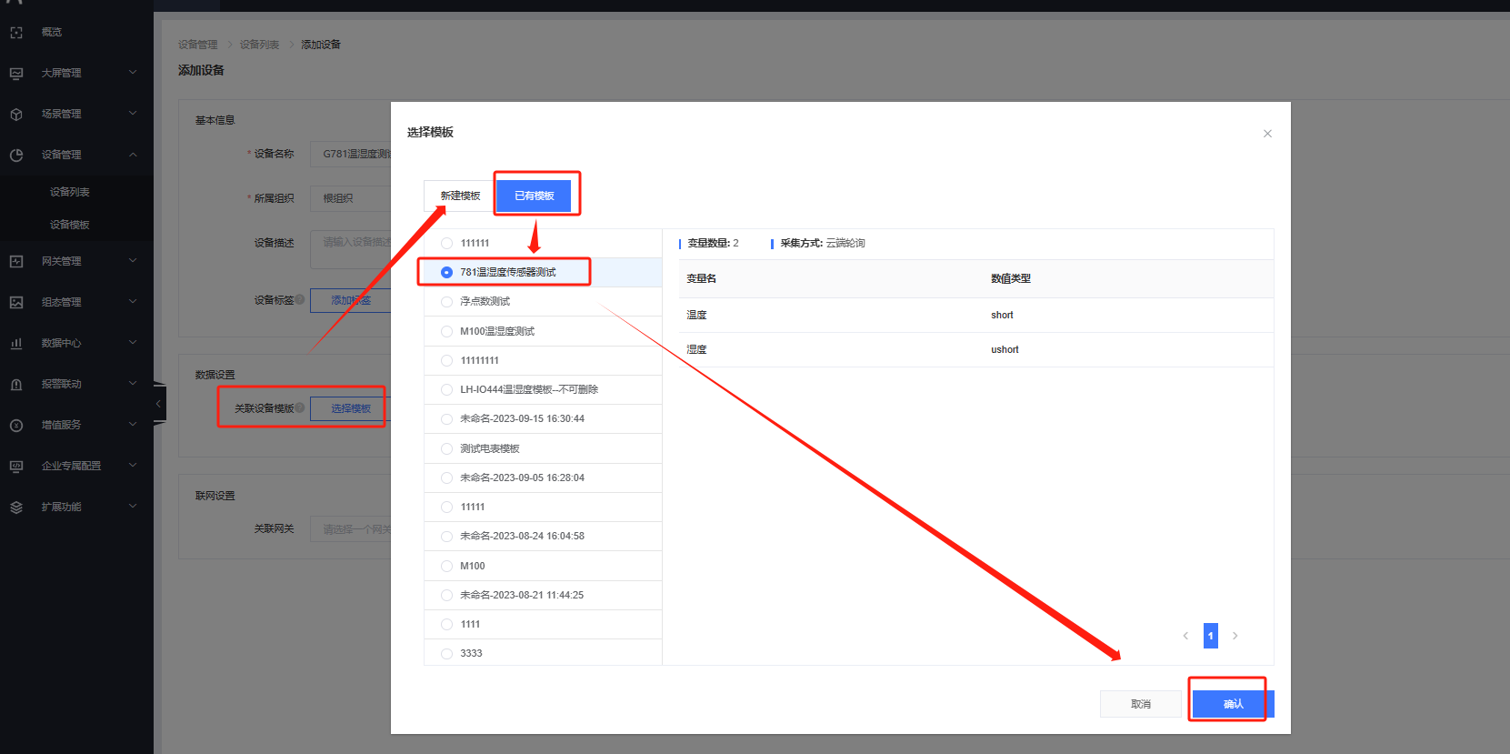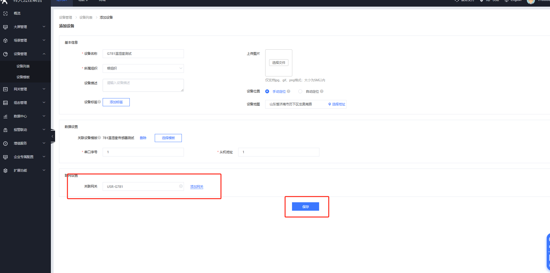 命名為G781溫濕度測試,選擇根組織,點擊選擇模板,綁定已有模板,串口序號選擇1,傳感器出廠默認地址是 1