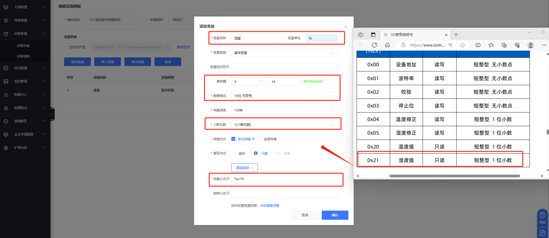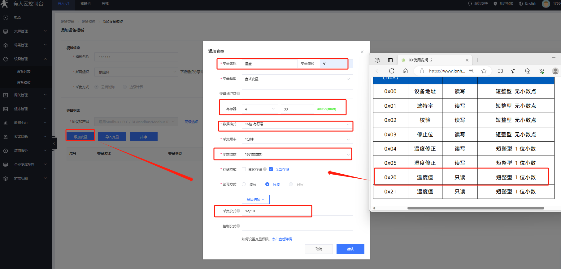 朗漢德高精度溫濕度傳感器是標準modbus rtu協(xié)議,溫度寄存器地址是0020(HEX),寄存器類型是保持寄存器,所以模板中寄存器地址是40033,添加采集公式即可。