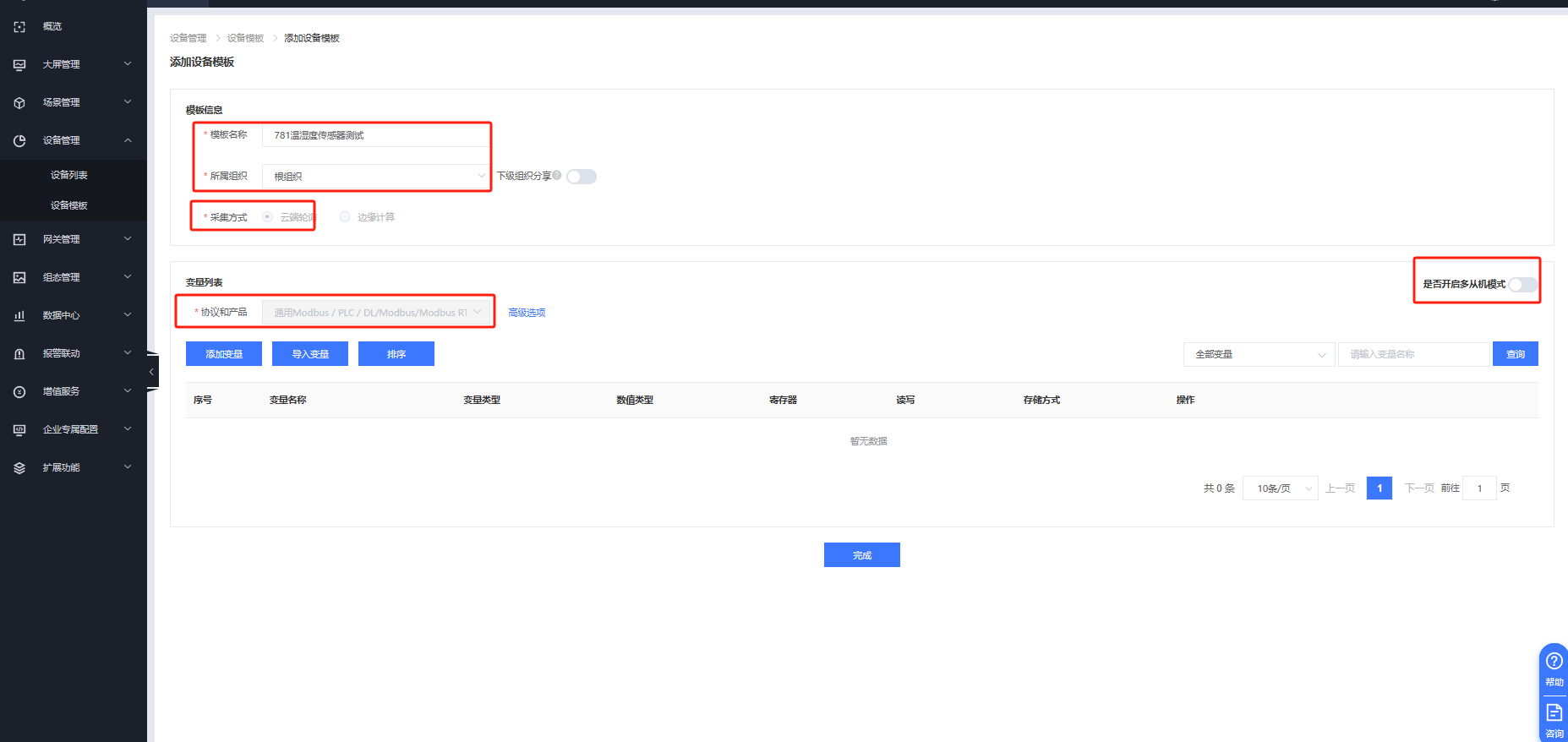 填入名稱,選擇根組織,選擇云端輪詢模板,協(xié)議選擇modbus rtu(若鏈接多個485從機設備可開啟多從機模式,案例中只有一臺溫濕度傳感器故沒有開啟多從機)