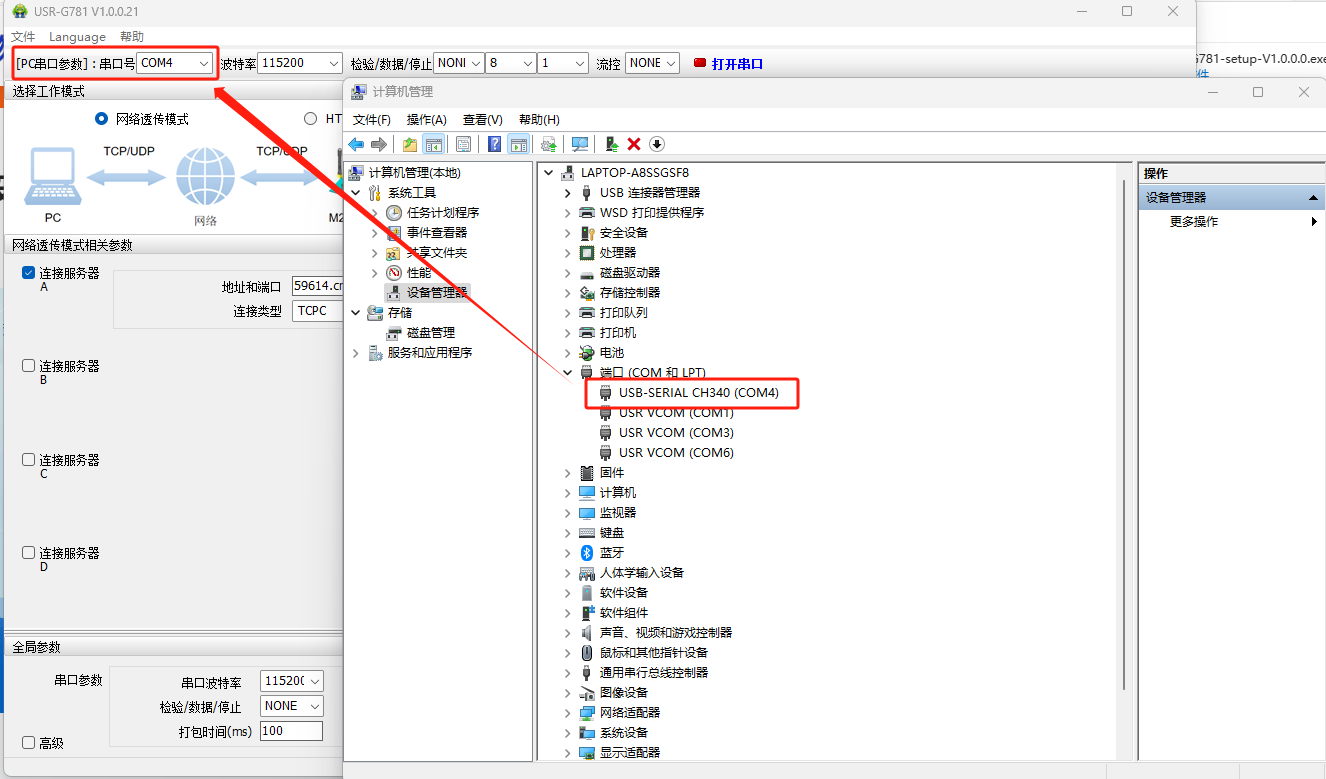 使用USB轉(zhuǎn)485轉(zhuǎn)換器接到電腦上,打開USR-G781配置軟件,從設備管理器中查看當前COM口4,軟件選擇COM4