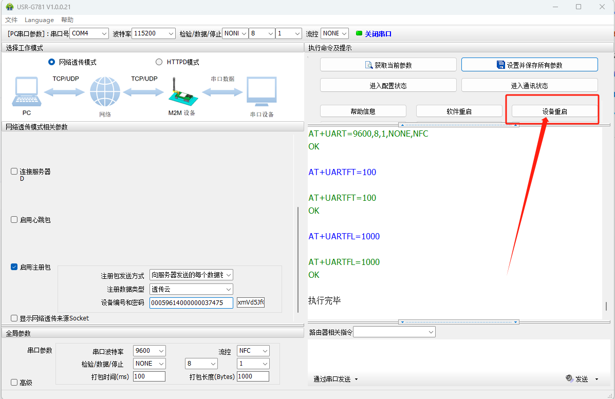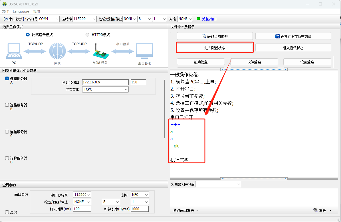 點擊進入配置狀態(tài),發(fā)送+++a,設備回復OK