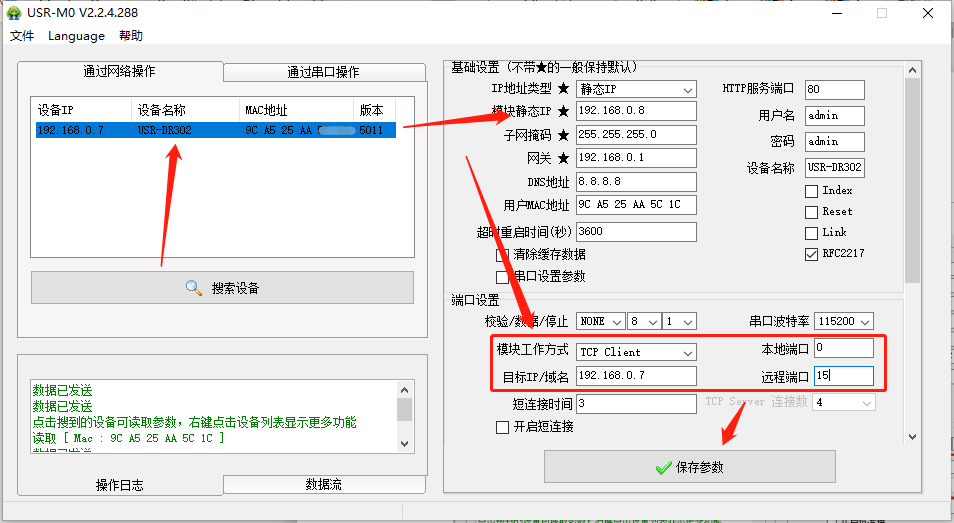 5、點(diǎn)擊“搜索設(shè)備”當(dāng)搜索列表中出現(xiàn)另一臺(tái)302的設(shè)備后,點(diǎn)擊搜索到的設(shè)備,為了防止IP沖突,將此設(shè)備IP修改為192.168.0.8,模塊工作方式設(shè)為TCP Client,本地端口0,遠(yuǎn)程端口15,點(diǎn)擊保存參數(shù)。