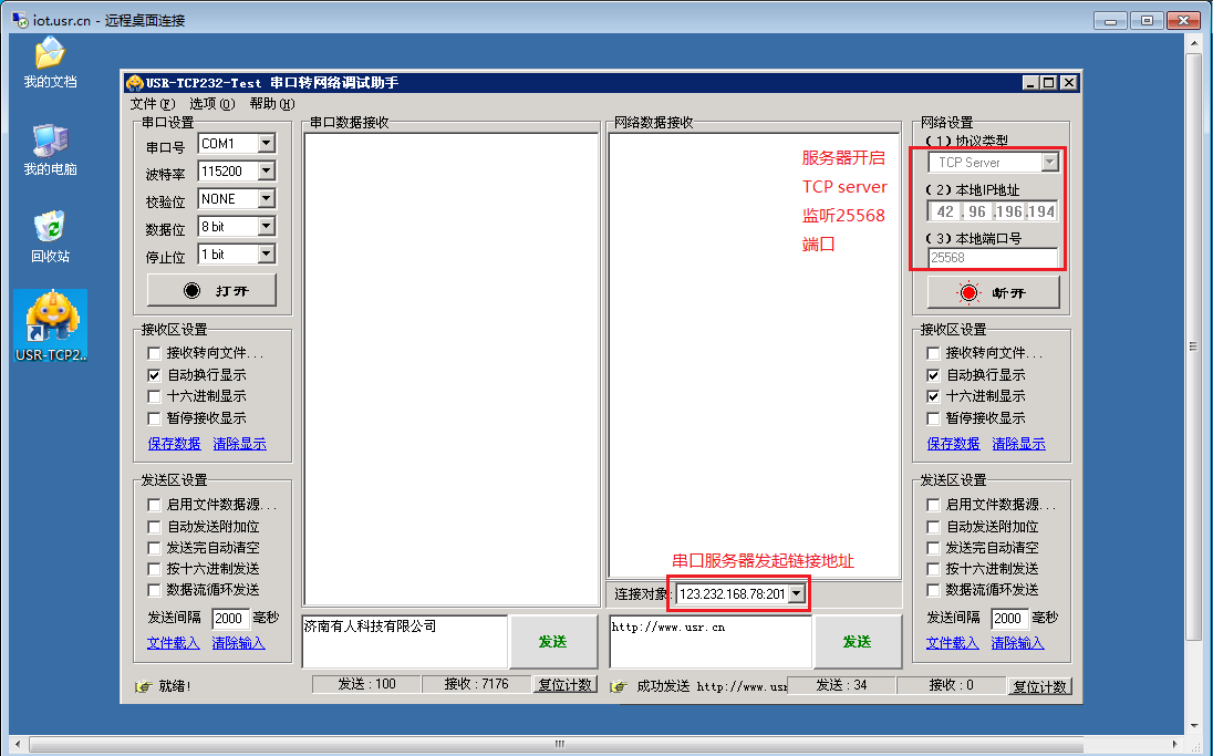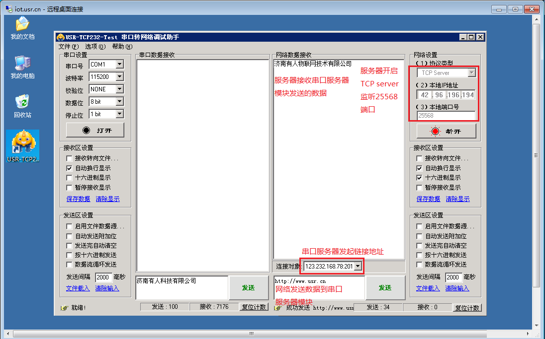 以上是服務(wù)器發(fā)送數(shù)據(jù)和接收數(shù)據(jù):以下使用電腦串口連接串口服務(wù)器串口,電腦運(yùn)行串口調(diào)試軟件,進(jìn)行發(fā)送和接收服務(wù)器的數(shù)據(jù)。