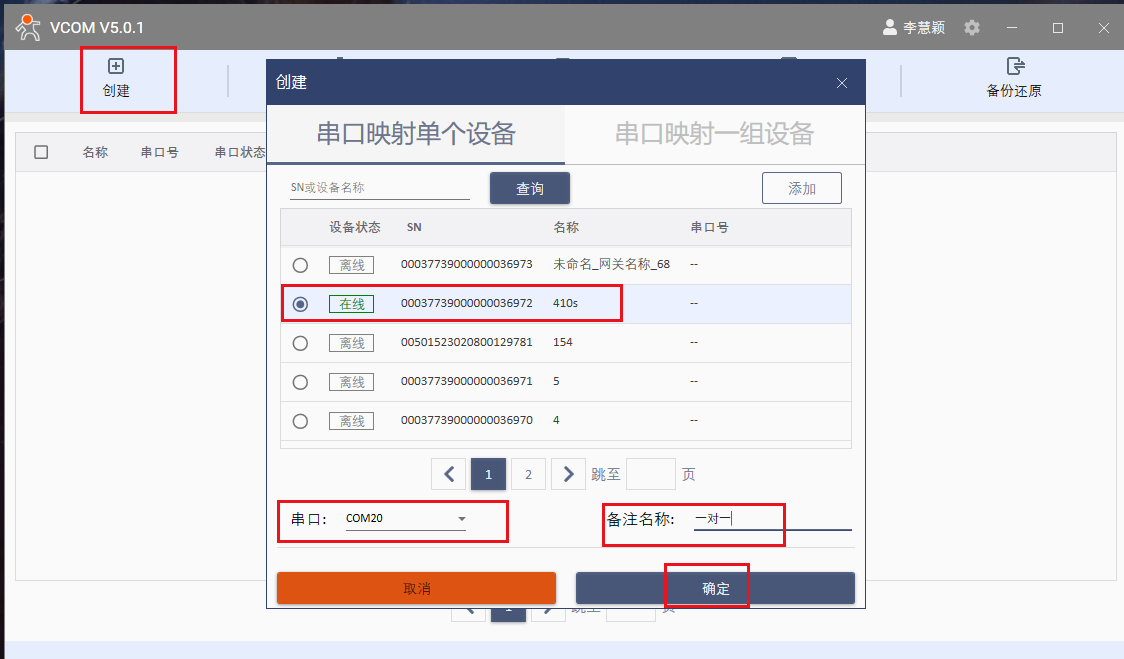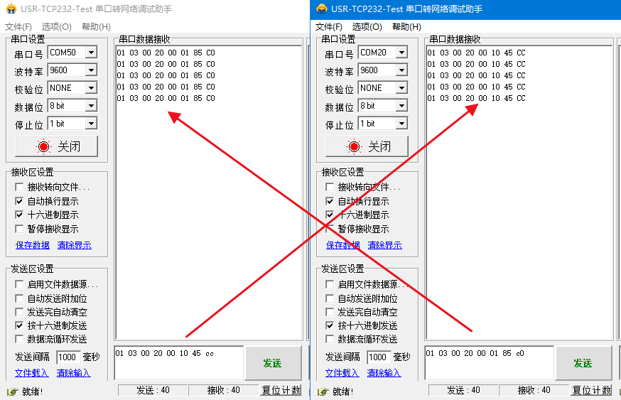 用串口調試助手分別打開410s用485轉usb接電腦上,識別的com口和虛擬串口com20,互發數據