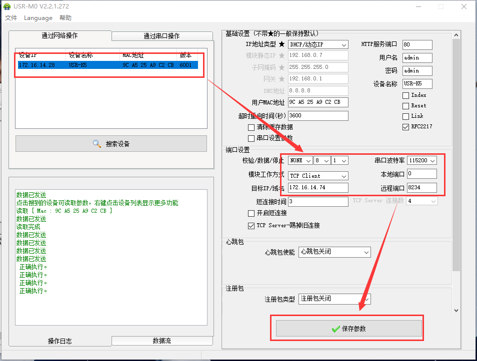 點擊“搜索設備”,當搜索列表中出現K5的設備后,單擊搜索到的設備,設置配置信息并保存(動態Ip),工作方式選擇TCp Client,目標ip為虛擬串口Ip:172.16.14.74,遠程端口為虛擬串口的本地端口號:8234