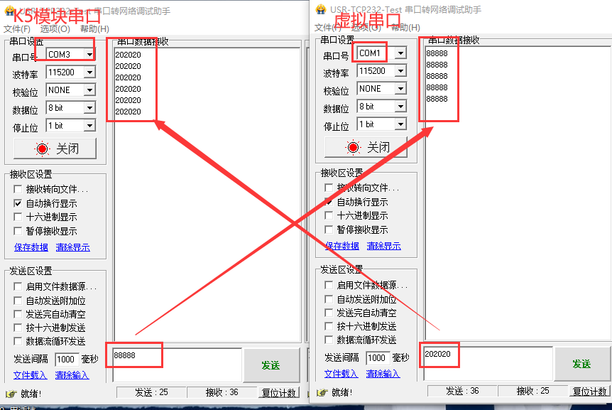 同時打開兩個串口轉網絡助手軟件。一個選擇虛擬串口,一個選擇COM3,即可進行收發測試