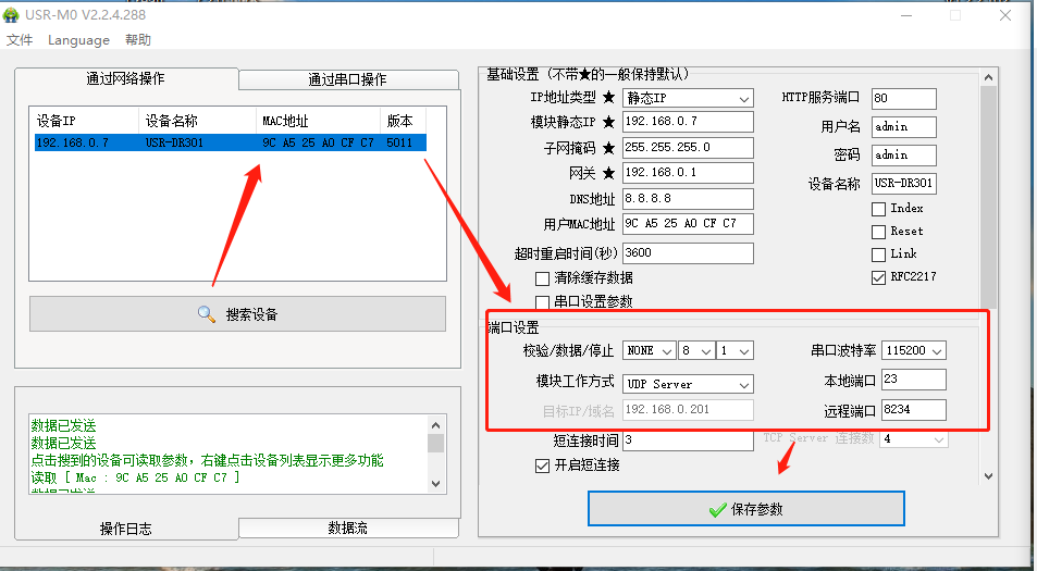 串口端選擇正確的串口(可在設備管理器--端口處查看)以及串口參數,301出廠默認115200,N,8,1。