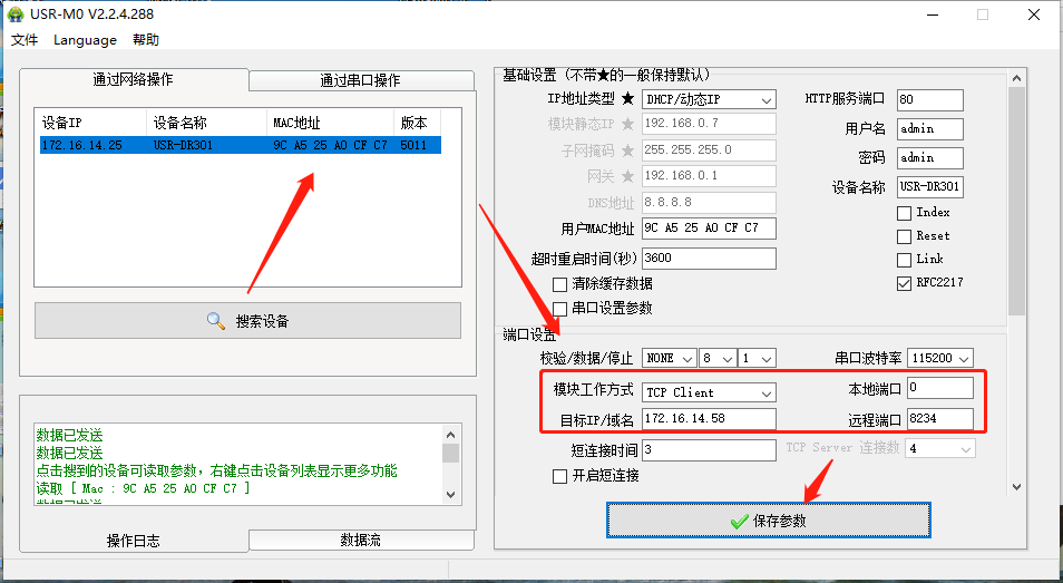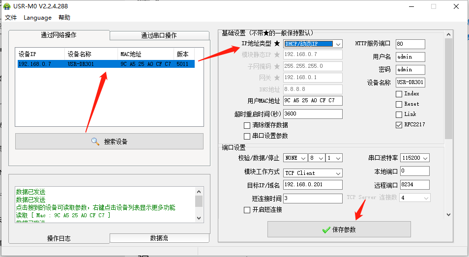 點擊“搜索設備”當搜索列表中出現301的設備后,單擊搜索到的設備,右邊基礎設置,在“Ip地址類型”將靜態Ip改為DHCp動態獲取,點擊保存參數。